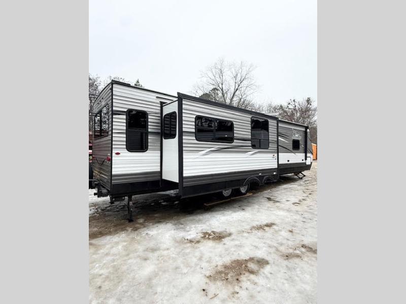 Can you picture yourself relaxing in the rear living area in this Jay Flight 34RSBS travel trailer? This model is perfect for a couple that enjoys plenty of space to invite other camper friends over or even the grandkids for a weekend away. The front master bedroom features a closet, and a second entry into the bathroom. The main living and kitchen area includes dual slide outs for more floor space, theater seats, and additional furniture that will provide extra sleeping space for the overnight guests. You will love watching the big game or a show while staying warm from the fireplace. Stop picturing yourself, and start camping in this Jay Flight!
