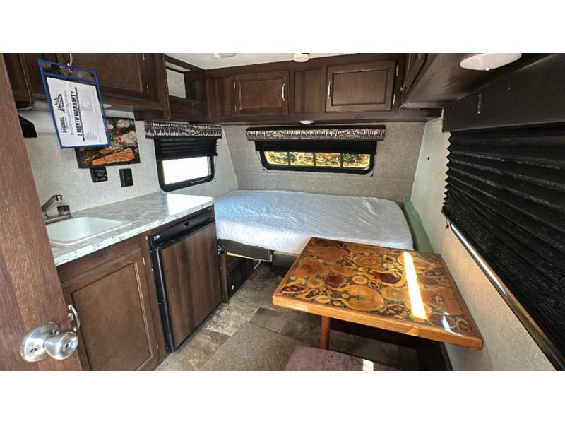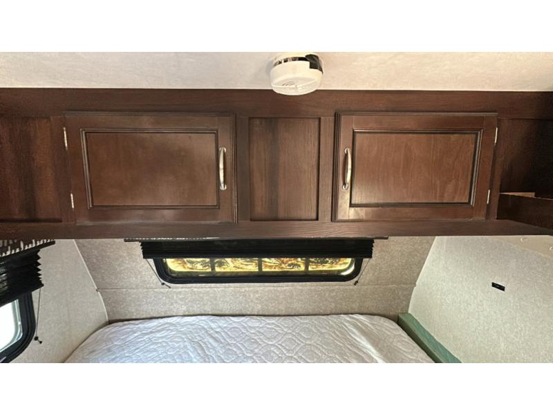 There is a front dinette and a sofa along the door side. You are sure to enjoy all of the overhead cabinets throughout this travel trailer.