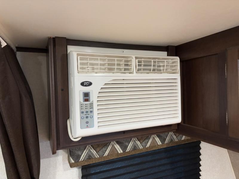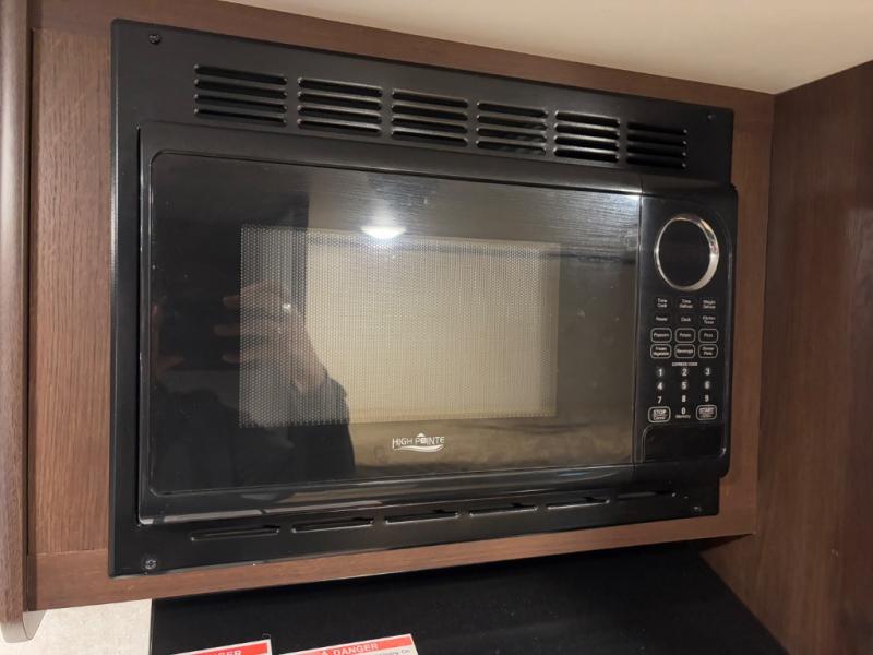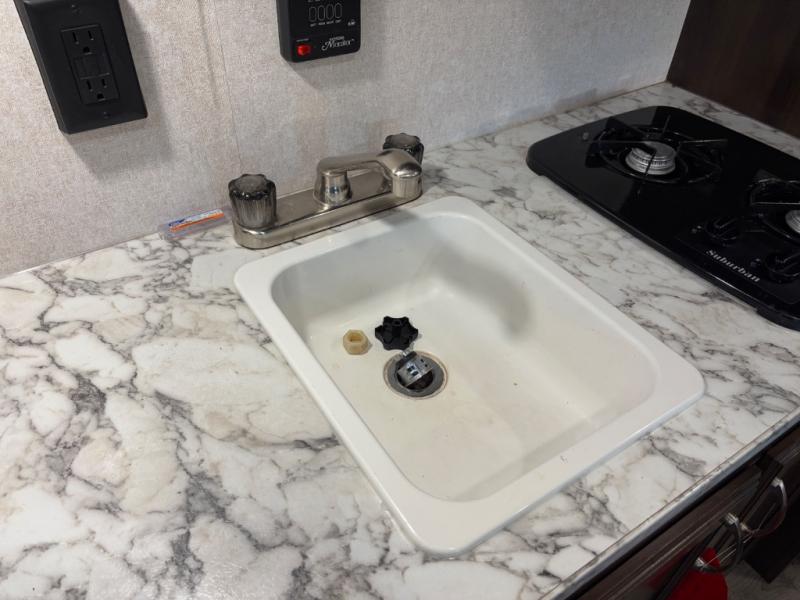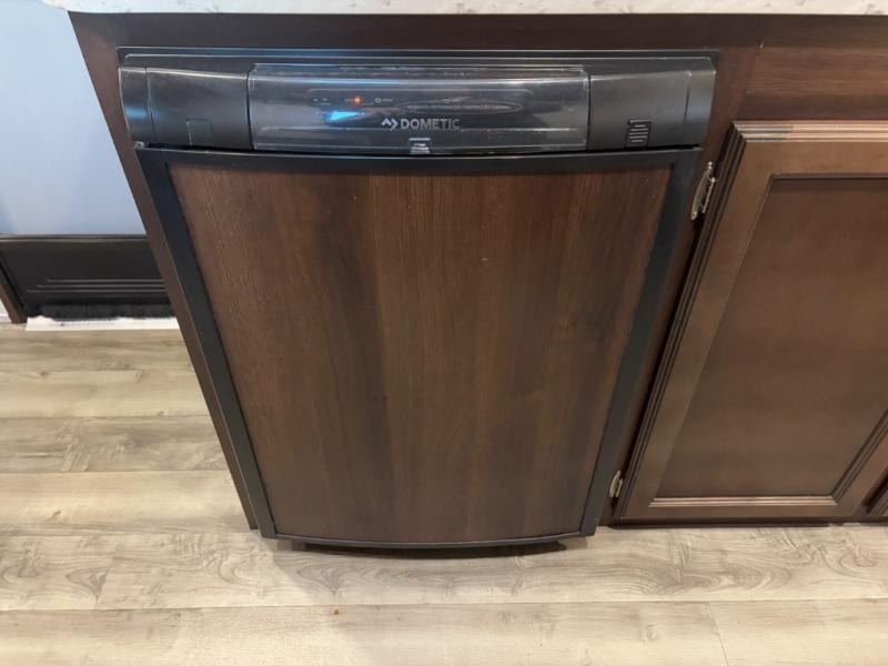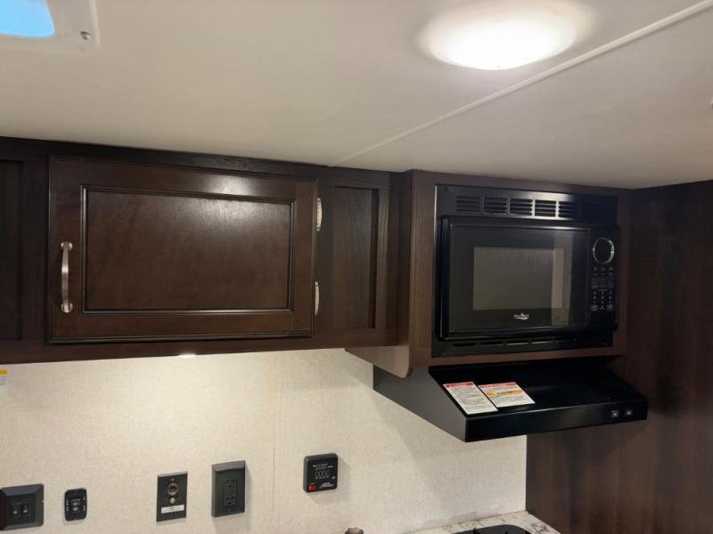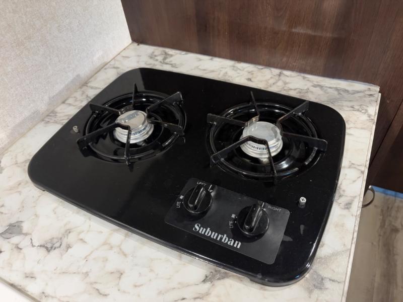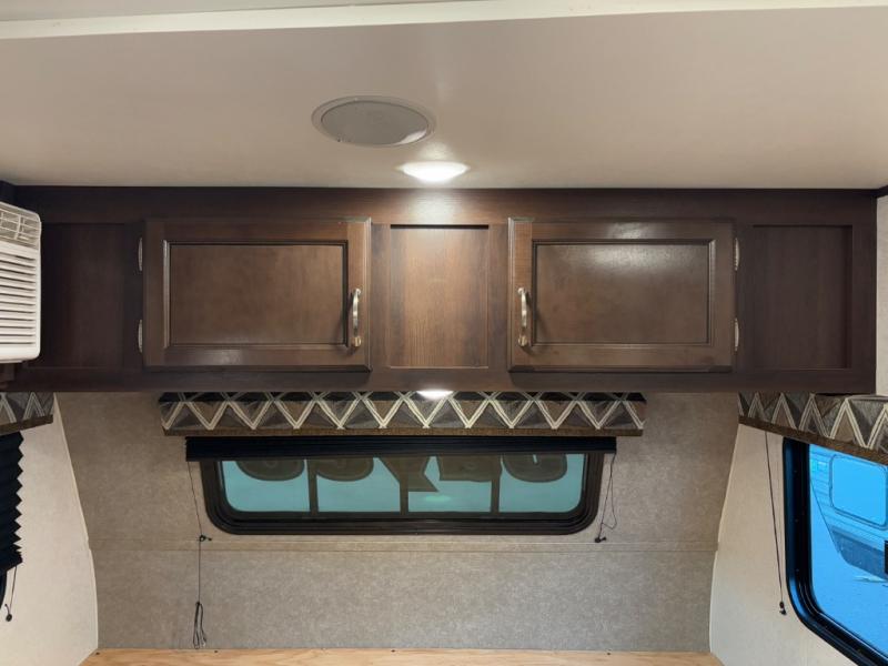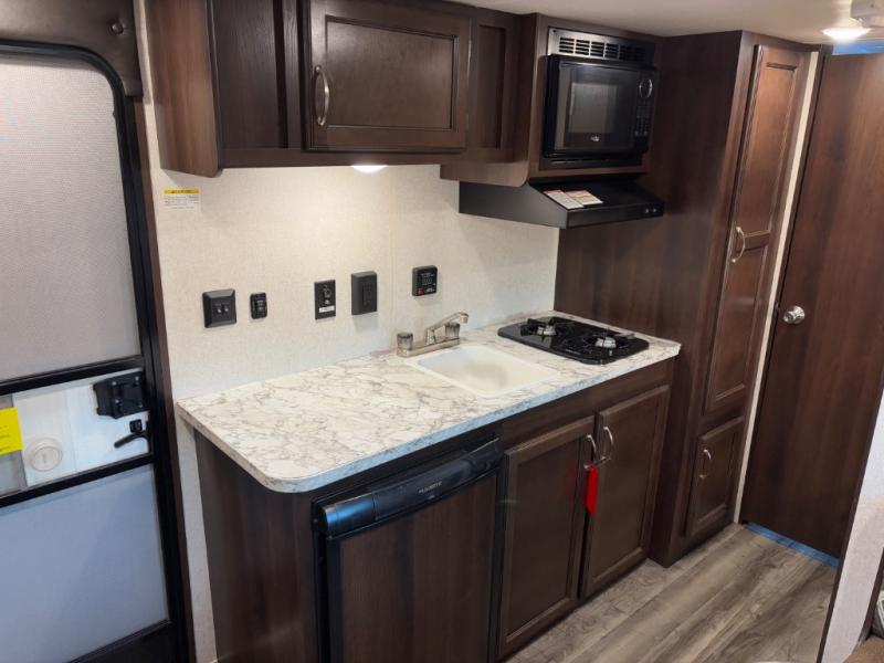 You can enjoy your meals at the booth dinette, and at night it easily converts into additional sleeping space. Along the opposite side there is a large pantry, two burner range, microwave, single galley sink, and a refrigerator below the counter.