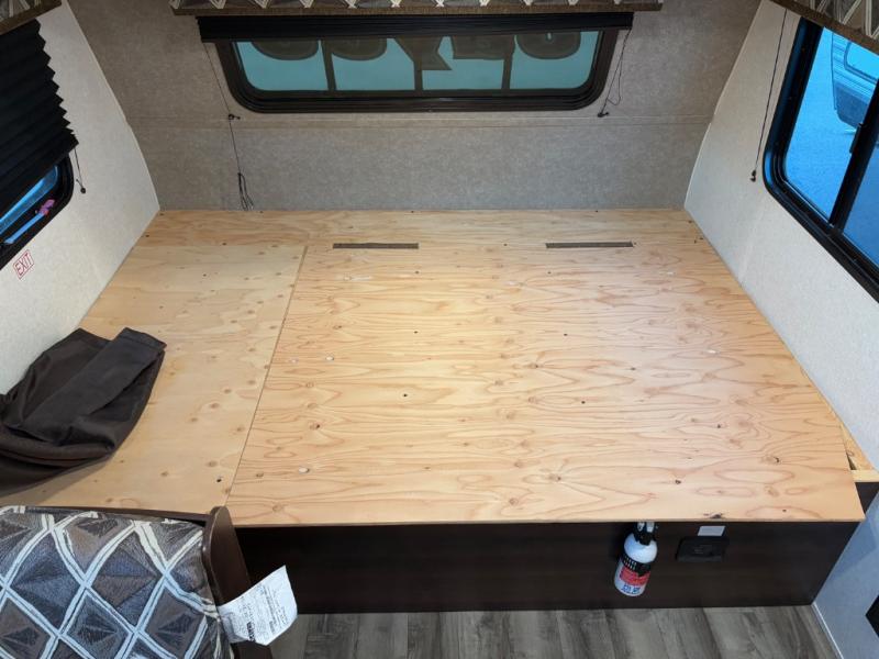 Step inside, to your right is a queen bed that runs the width of the front wall of the trailer. There are overhead cabinets and a privacy curtain as well.