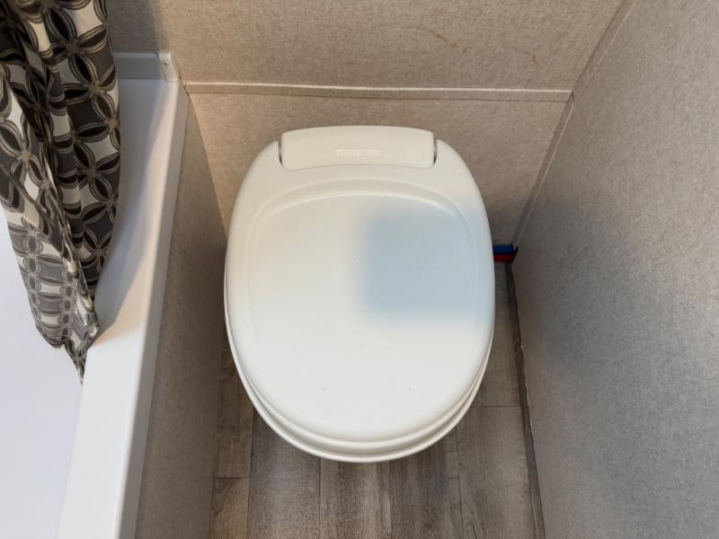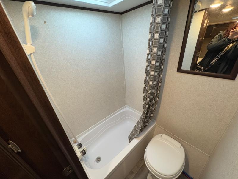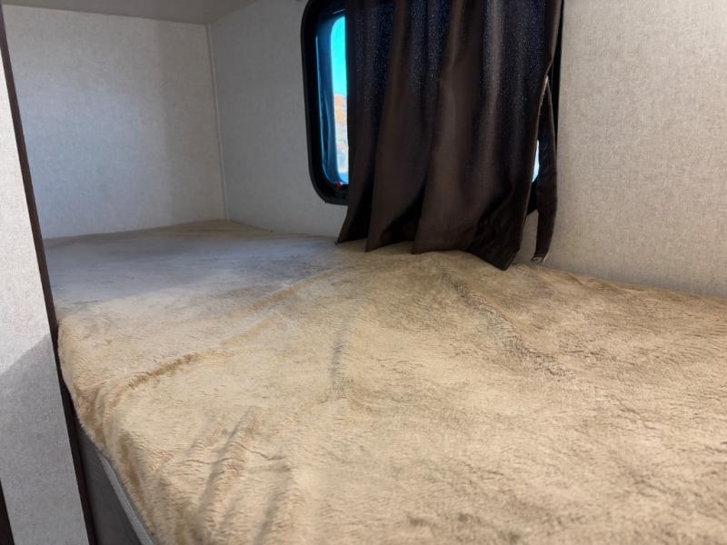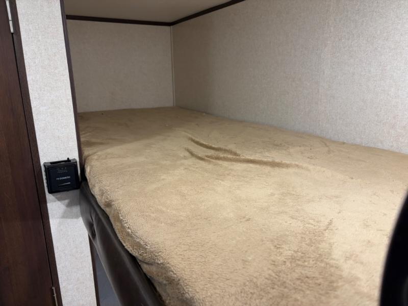 There are bunk beds in the rear right corner of the trailer. In the rear left corner you will find the bathroom with a toilet and tub/shower.
