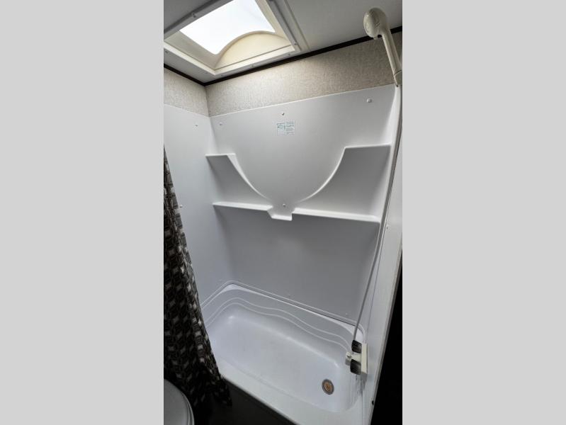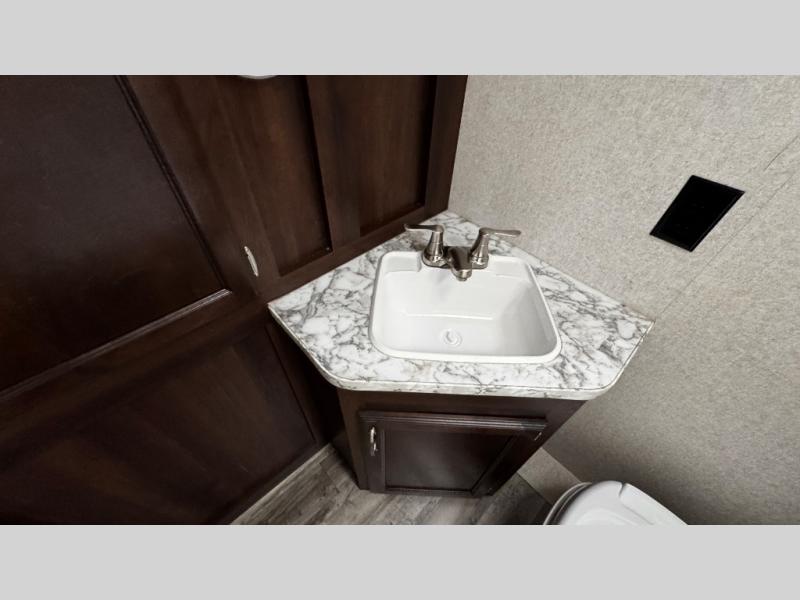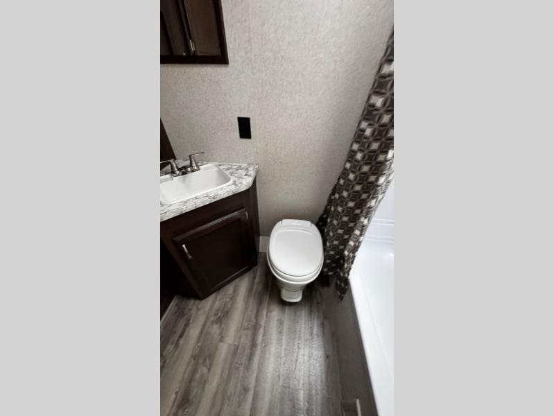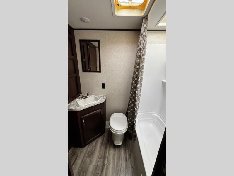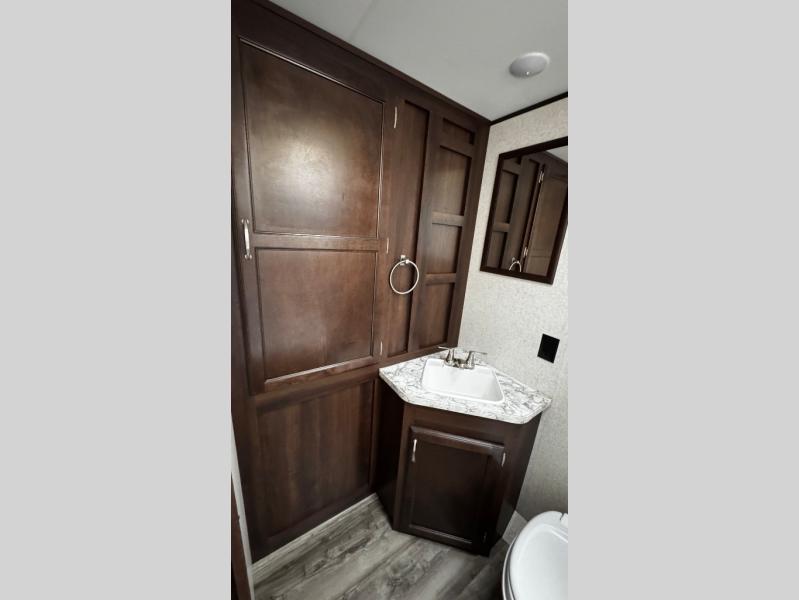 Along the rear of this model is the bathroom. Here you will find a tub/shower, toilet, sink, and a large wardrobe for your hang up clothes.
