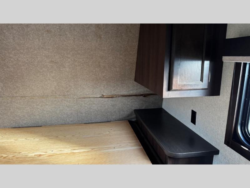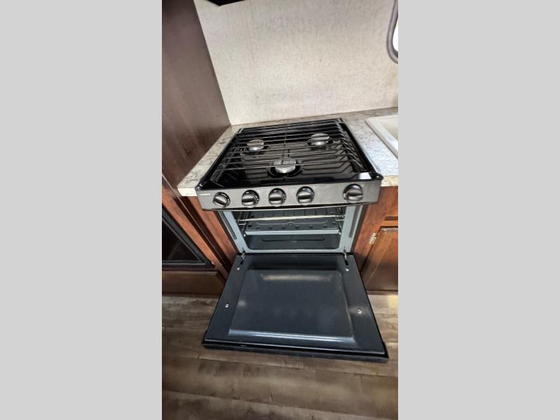 As you enter this model, straight in front of you is the sofa which faces towards the rear of the trailer. To the left of the door you will find a dinette with an overhead cabinet. The dinette easily converts into additional sleeping space if needed. Along the road side is where you will find the kitchen appliances. Here there is a double sink, three burner range, overhead microwave, and a refrigerator for your perishables. The overhead cabinet is a great spot for your dishes.