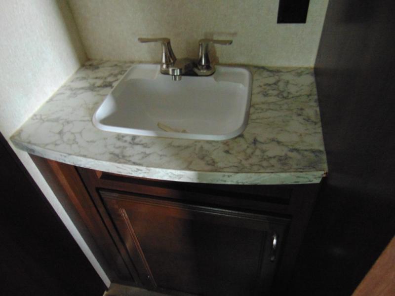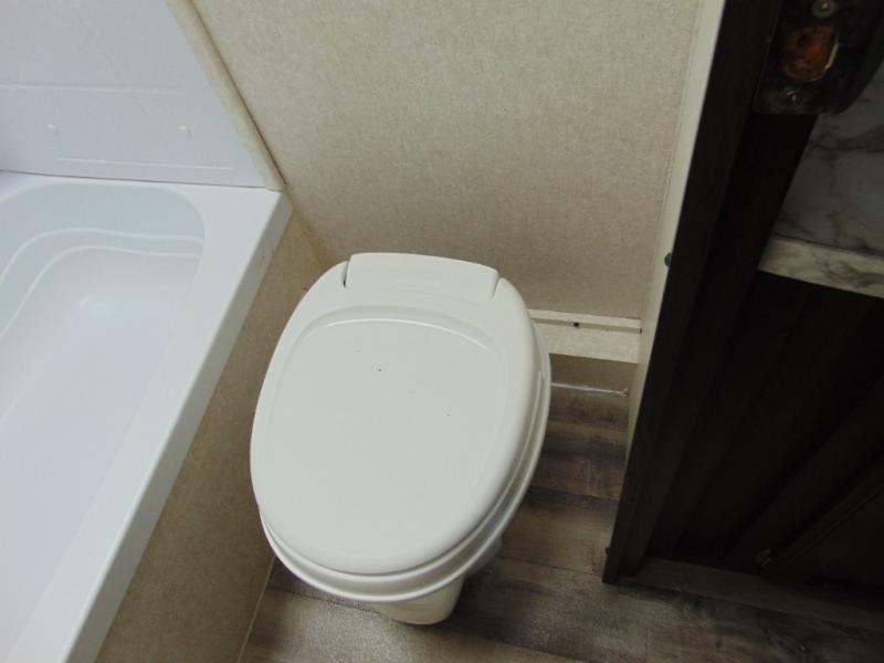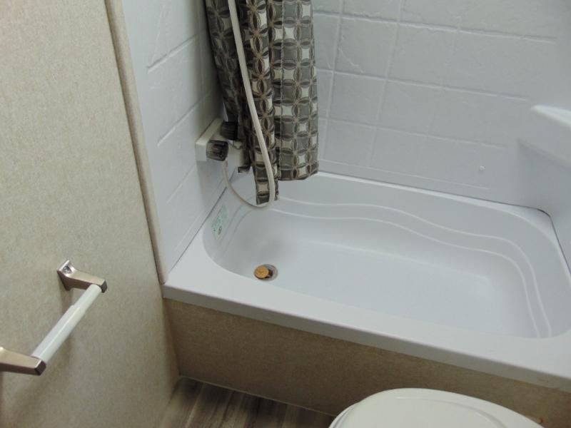 The bathroom is located in the right rear corner of the trailer. In the bathroom there is a tub/shower and toilet. Just outside of the bathroom area there is a sink.