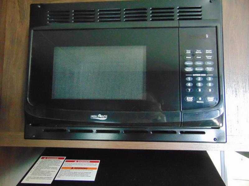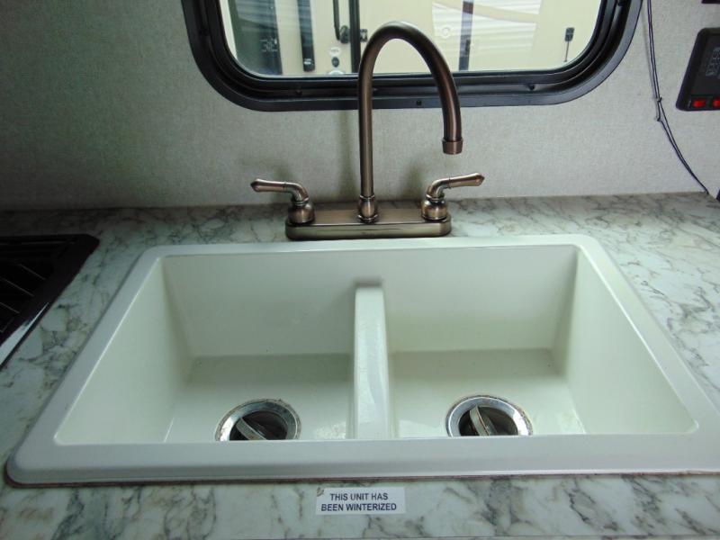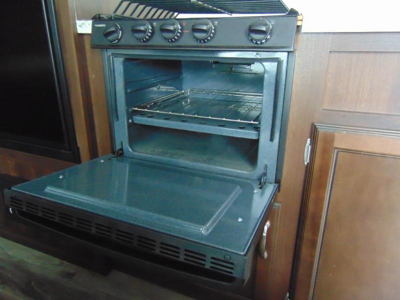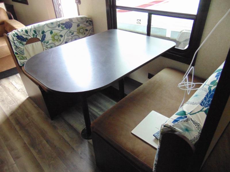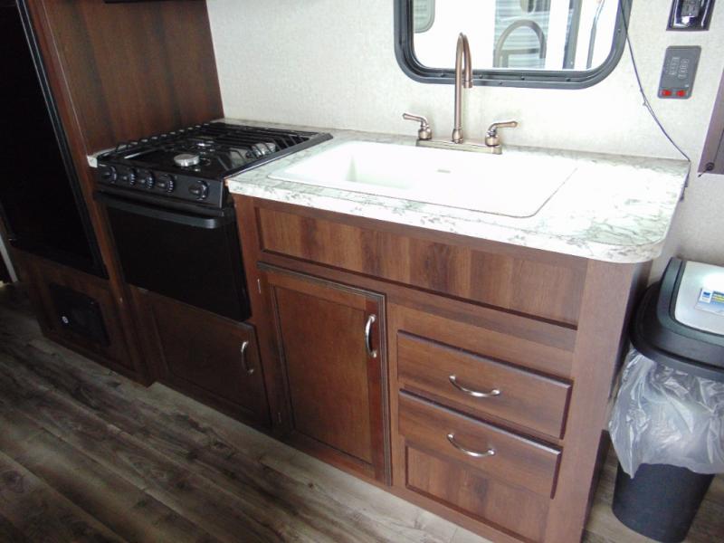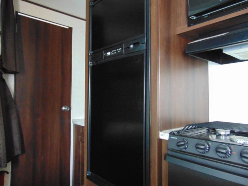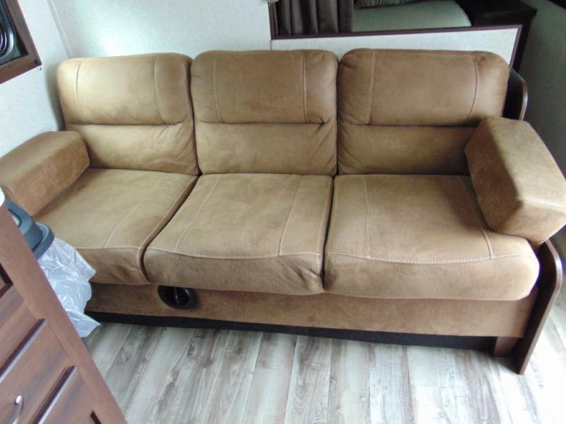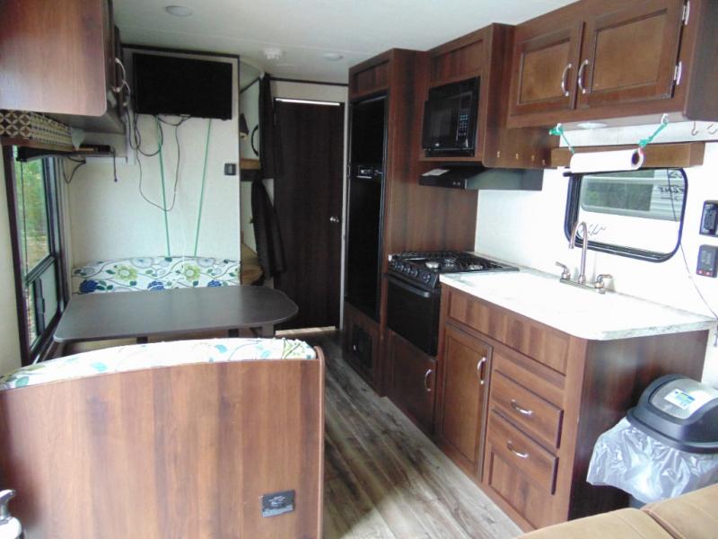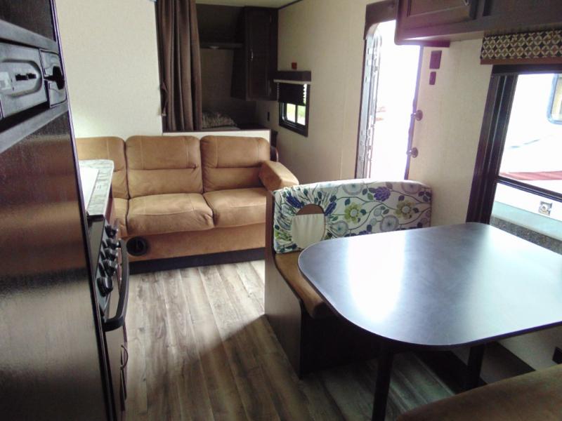 As you enter the travel trailer, to the left there is a dinette. Across from the dinette you will see a refrigerator, three burner range, microwave, and double kitchen sink. There is also a nice sofa in the main living area.