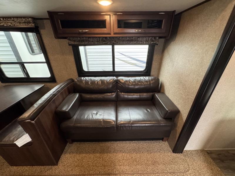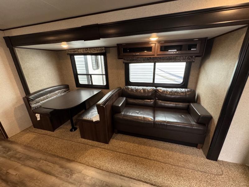 In the main living area you will enjoy ample space for everyone thanks to the large single roadside slide. Within the slide you will find a standard booth dinette and sofa with storage above the sofa side. If you wish, you can choose a hide-a-bed option, and a dining table with four chairs instead.