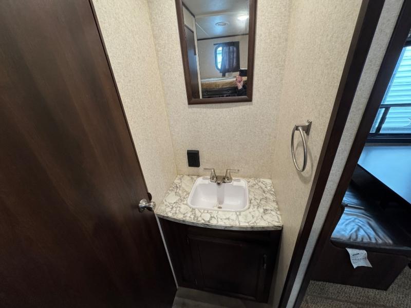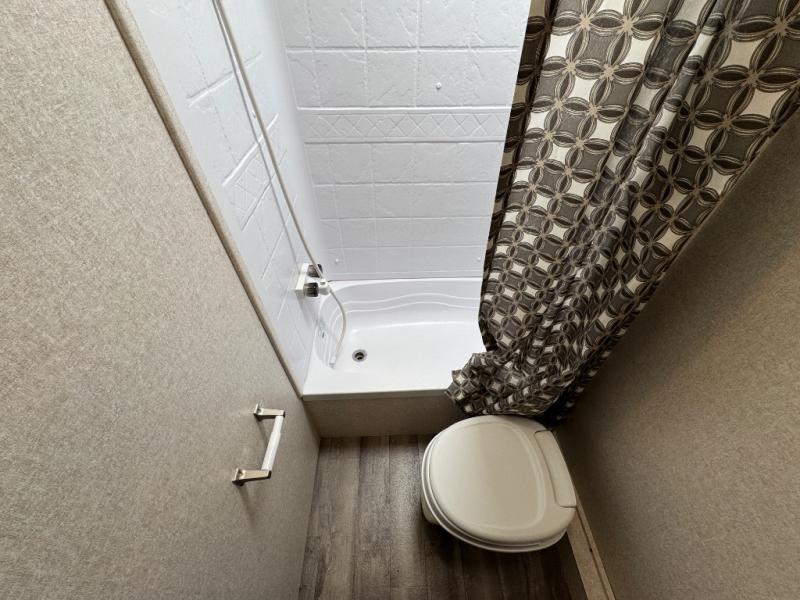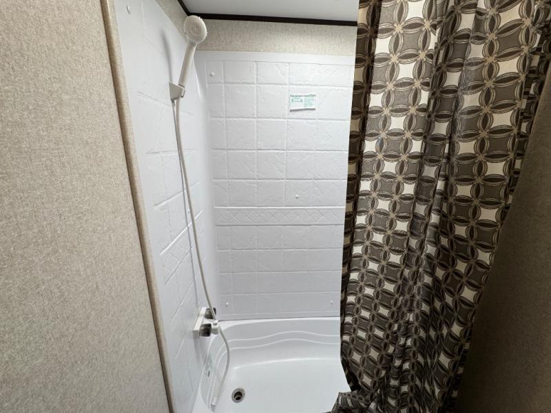 In the rear of this model there is sleeping for four with a double bed set of bunks. There is also a curtain that can be pulled for privacy, and the bathroom is located conveniently next door. Here you will find a private tub/shower and toilet, and the sink is located just outside the bathroom door.