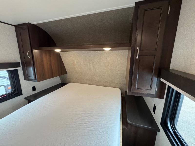 Step inside and notice the entertainment center just off the foot of the queen bed in front. You will find curtains that can be pulled at night for privacy on either side of the entertainment center. For your clothing there are dual wardrobes, and an overhead shelf above the head of the bed for your things.