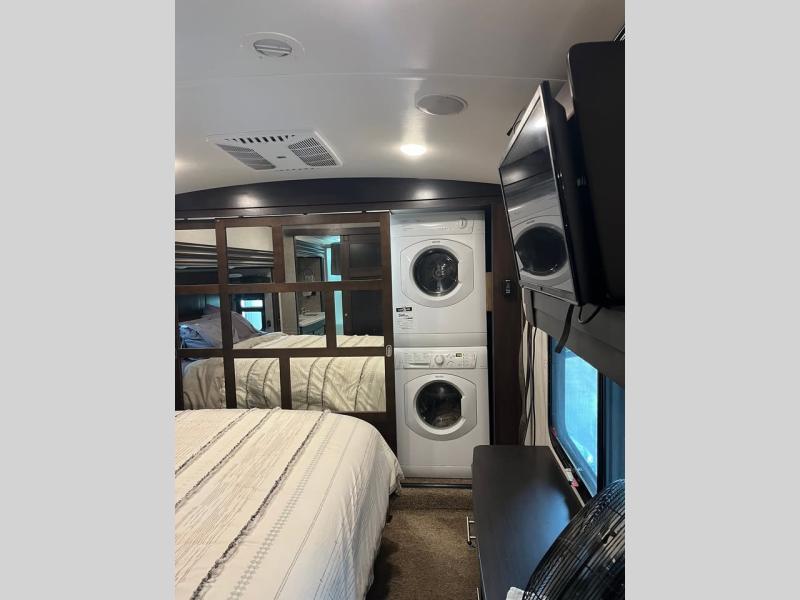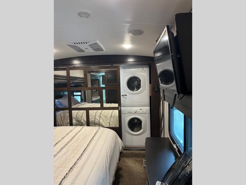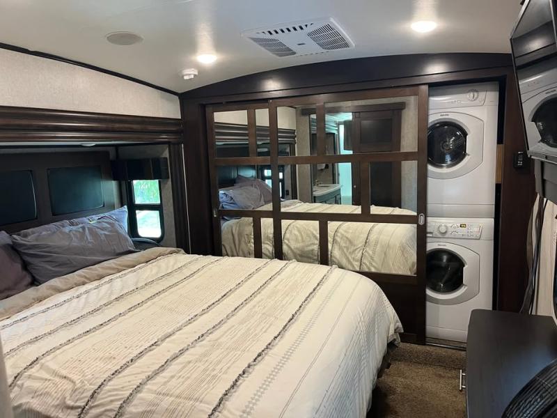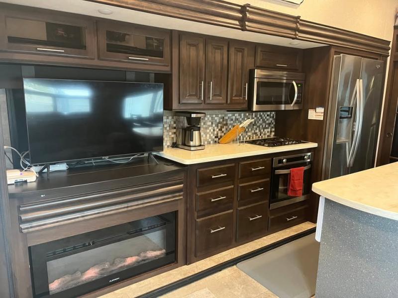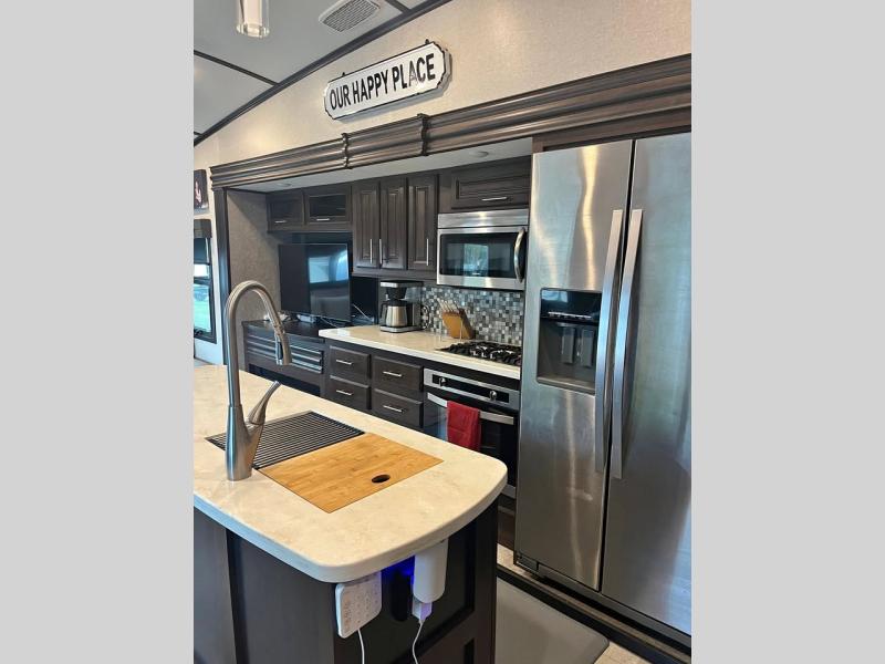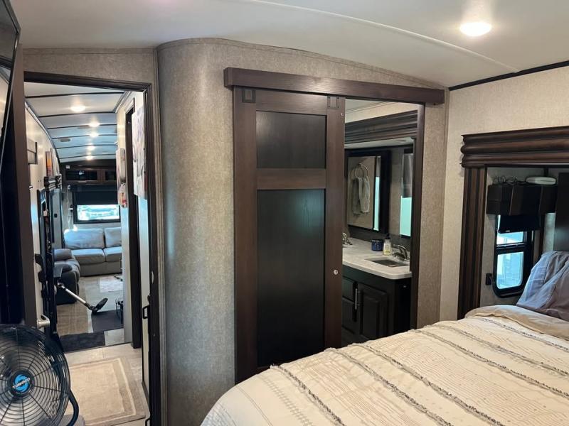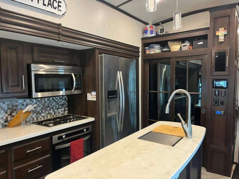 For your next camping adventure you will want this quad slide out 381DLQS North Point fifth wheel. Meal prep is a breeze in this kitchen. Here you will find an island with a double sink, a residential refrigerator, plus a large pantry for your canned goods. Come relax with your family and friends in this rear living area. Within the roadside slide out there is a TV with a fireplace. In the bathroom there is plenty of space for two people to get ready without feeling cramped. Here you will find a large shower and two sinks plus a toilet. At night come retreat to the private front bedroom where you will find a KING bed plus a spacious walk-in closet.