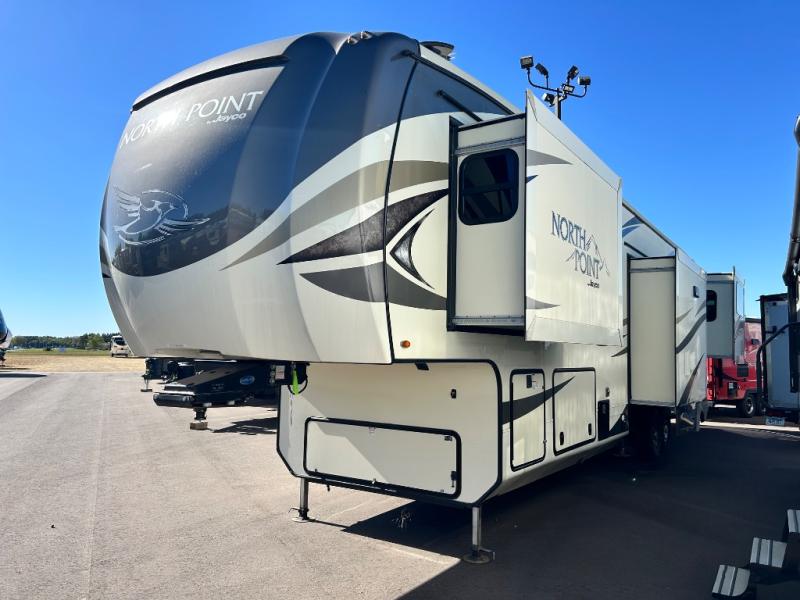For any camping trip you will want a Jayco North Point fifth wheel. These models feature a Climate Shield which includes an enclosed, insulated, and heated underbelly, a high-BTU furnace, and Astrofoil in the roof and floors. Inside each model there is a Furrion Executive Chef gas cooktop, a stainless steel residential microwave, and USB charging centers in the living area, kitchen, and bedroom. The residential-grade wood-plank vinyl floor is easy to clean and will last for years to come. Now if that isn't enough to draw your attention, then you will like the mandatory North Point Luxury Package or the mandatory Customer Value Package which includes an arched interior ceiling, solid surface kitchen countertops, frameless G20 dark-tinted windows, slam-latch baggage doors and so much more!