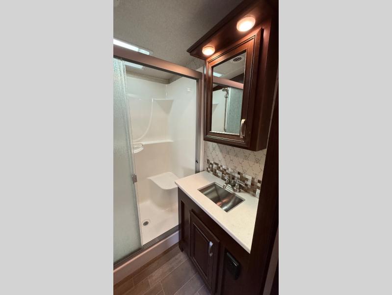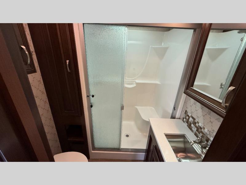 Each Jayco Pinnacle is equipped with the exclusive 5-Star Handling Package, an aerodynamic front and rear cap, an enclosed, insulated, and heated underbelly for four seasons of traveling, and a seamless composite roof covering making traveling down the road smooth and comfortable as well as each stay. The luxury fifth wheel also provides an arched interior ceiling, solid-surface kitchen countertops, an indoor/outdoor central vacuum system, an electric, thermostat-controlled fireplace, a whole coach water purification system, and so much more. Come choose your favorite luxury fifth wheel today!