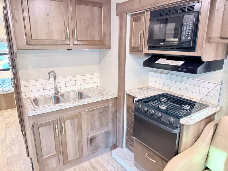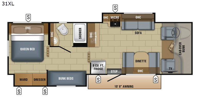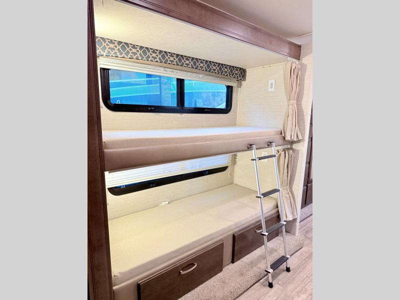 Start thinking about all the places you and your kids will visit while driving down the road in this Redhawk class C gas motorhome. Model 31XL allows you to travel and sleep in comfort as well as dine and get cleaned up in your own RV. You will find a semi-private rear bedroom for yourself, a semi-private bunk bed room for the kids, and a TV over the cab for everyone. When it's time to retire for the evening, the walk-around queen bed, and bunk beds provide your own bedding no matter where you choose to stay. You can cook meals or heat up leftovers, the choice is yours. You will even find a place for your golf clubs, camp chairs, and kids' toys in one of the exterior storage compartments. It's time to stop thinking and start planning your family vacation in a Redhawk motorhome.