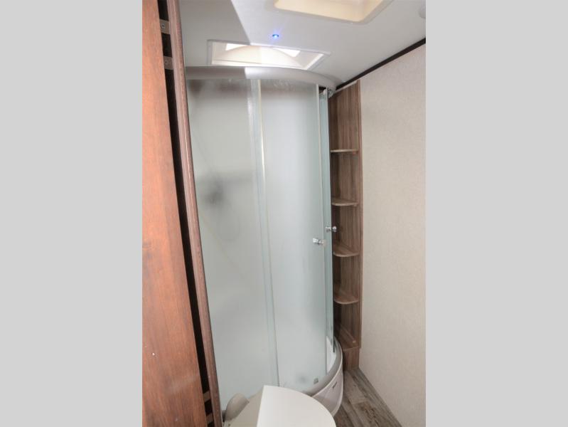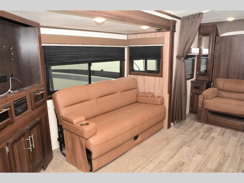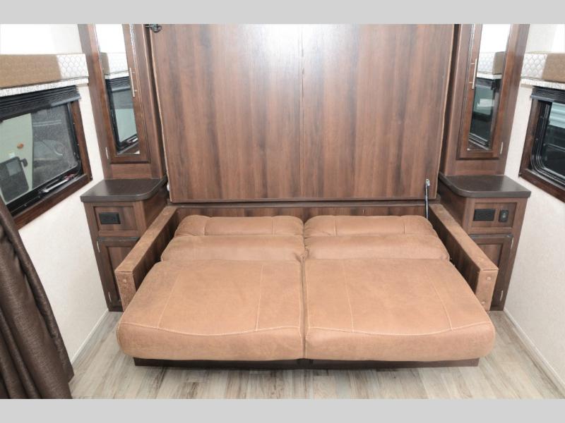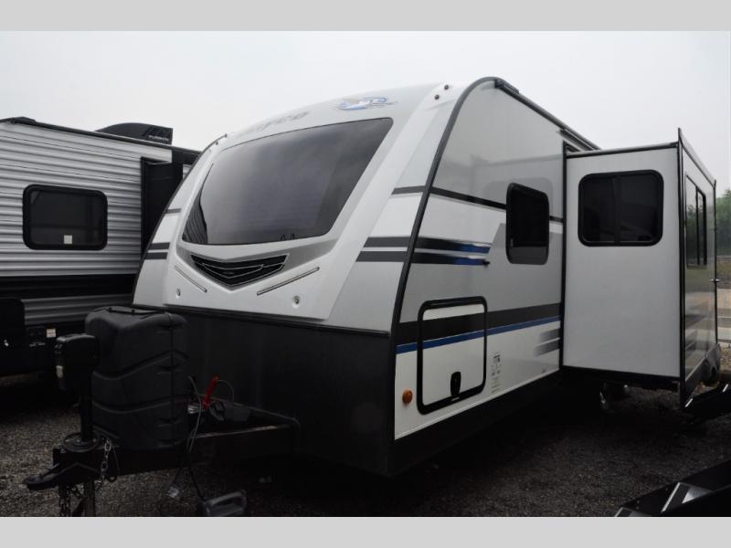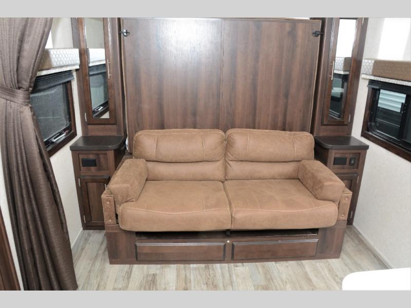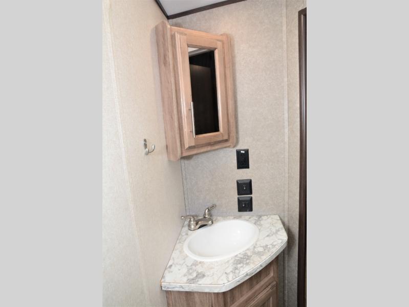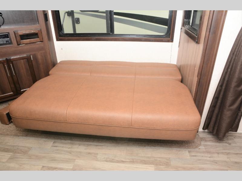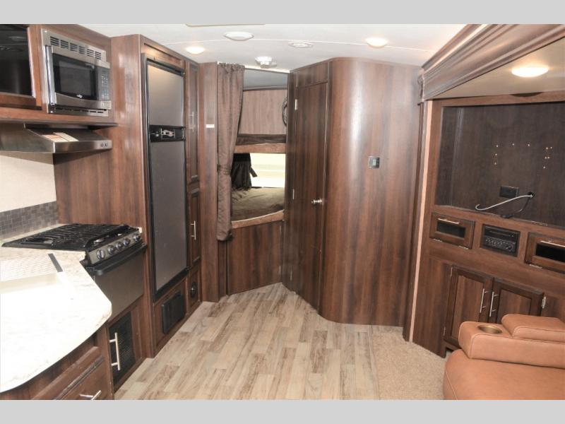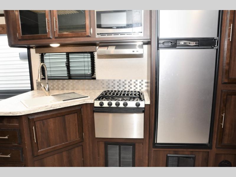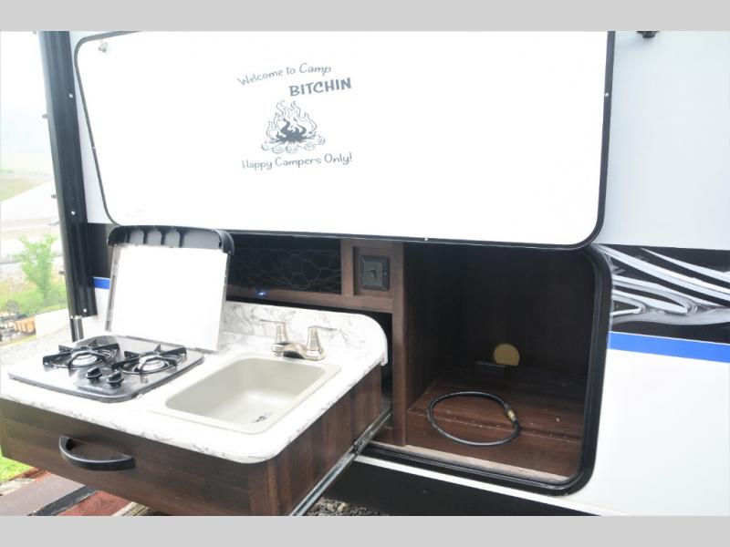 Traveling in this White Hawk travel trailer is like traveling in the lap of luxury. With the addition of the Murphy bed, you can decide whether or not you want the front of the trailer to be used as extra seating for the living area, or as a semi-private bedroom. The semi-private bunkhouse gives you the space that you need in this model to sleep seven people comfortably. If you get tired of spending every day cooking indoors, then you can take your preparations outside to prepare dinner in the outdoor kitchen, and the bathroom skylight allows some of that outdoor sunshine to brighten up the 34" radius shower.