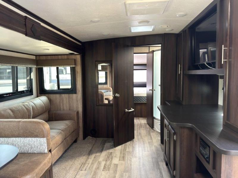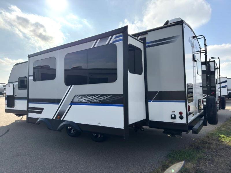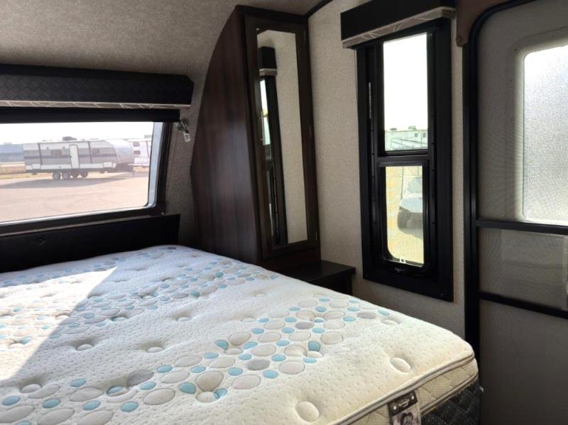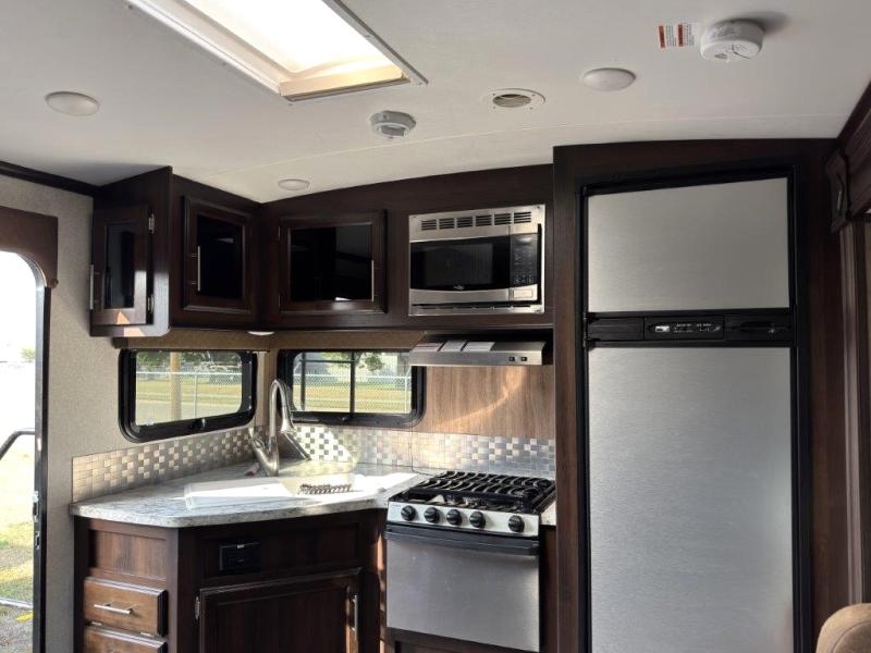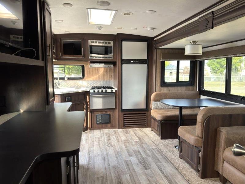 For worry-free family fun, take your next adventure in this White Hawk travel trailer. The booth dinette and tri-fold sofa add plenty of seating space to the living area so that you can enjoy a movie night on the 39" LED TV with the whole family, and the rear kitchen with residential appliances gives you the perfect space to create those movie-night snacks everyone loves. The walk-through bathroom gives you the extra room that you need as you get ready for the day, and the skylight brightens up the entire space with the sunshine that it brings in each morning. Because this trailer has two entry/exit doors, the front bedroom is able to have its own private entrance to and from the trailer.
