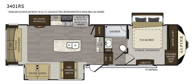 Are you ready for a cozy weekend away with this Alpine 3400RS fifth wheel at your favorite destination? Throughout this model, you will enjoy all of the livable space with triple slide outs. In the evenings plan to have a fire in the fireplace and relax on the tri-fold sofa or the lounge chairs and watch a movie on the 50" LED TV. Your meals can be enjoyed at the free-standing table, and meal prep is easy with the kitchen island, two burner range, and there is a large refrigerator for your food storage. The front bedroom has a king bed with storage below, plus more storage can be found in the closet and chest of drawers.