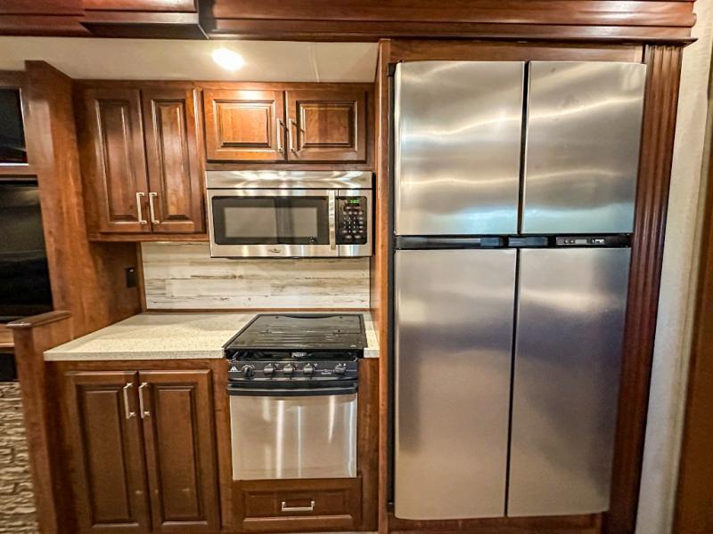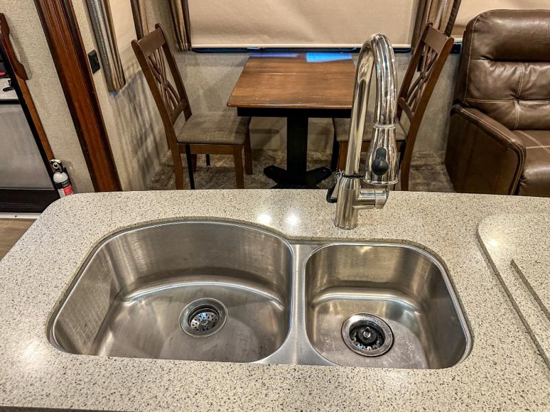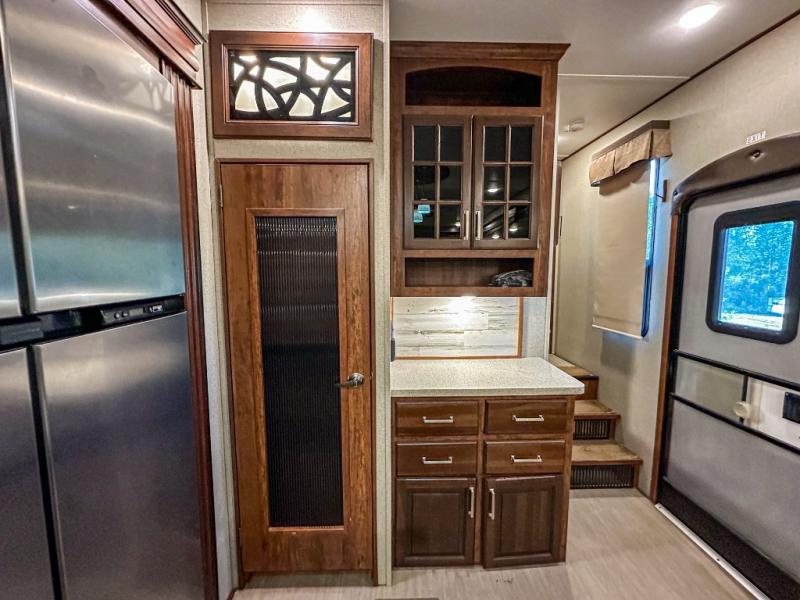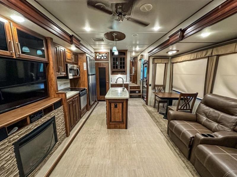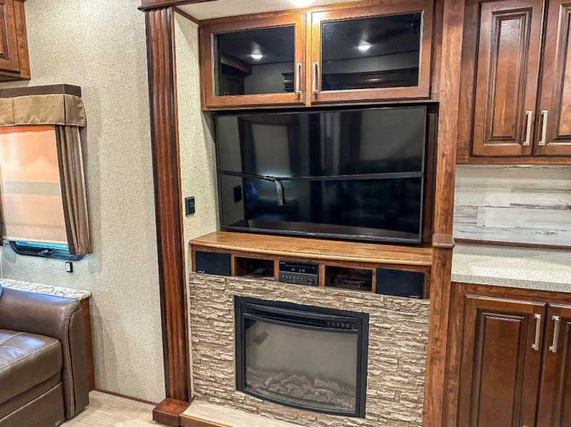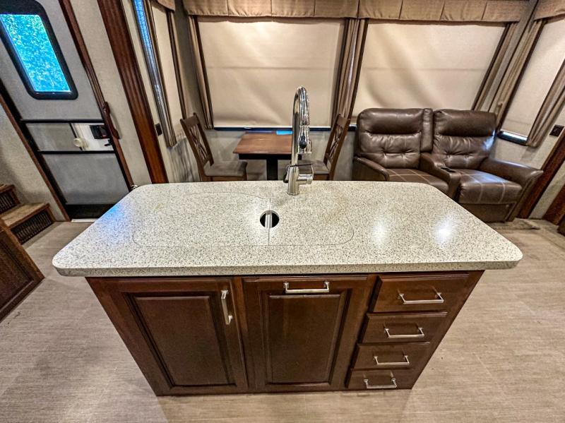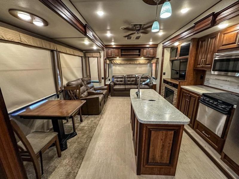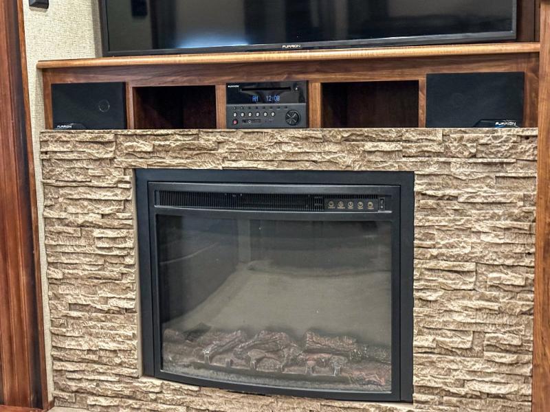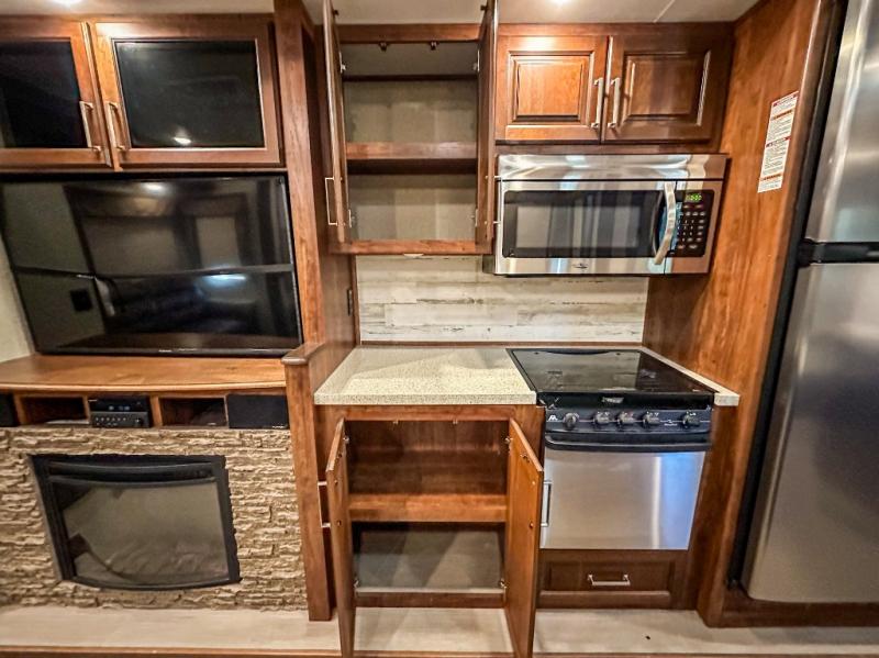 The perfect fifth wheel for entertaining and relaxing is this Keystone Avalanche model 320RS. The combined living and kitchen area includes dual slide outs for more walking around floor space, plus seating for 9 people with the furniture provided. This unit offers an 18 cu. ft. refrigerator, and a kitchen island for serving appetizers and cleaning the dishes in the sink. There is an entertainment center and a 50" LED TV for your inside enjoyment with a fireplace to keep you warm, plus a pantry, curio, and much more!