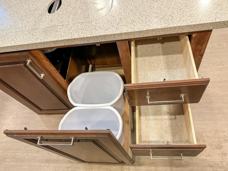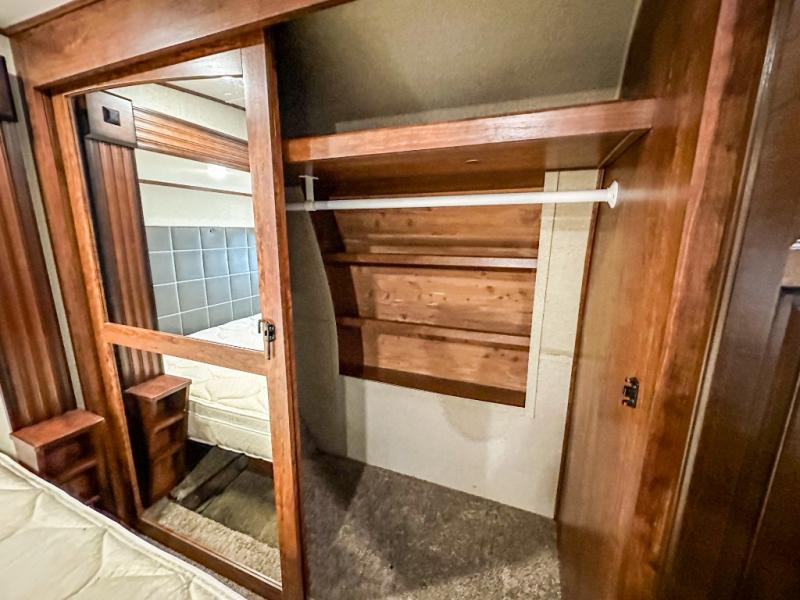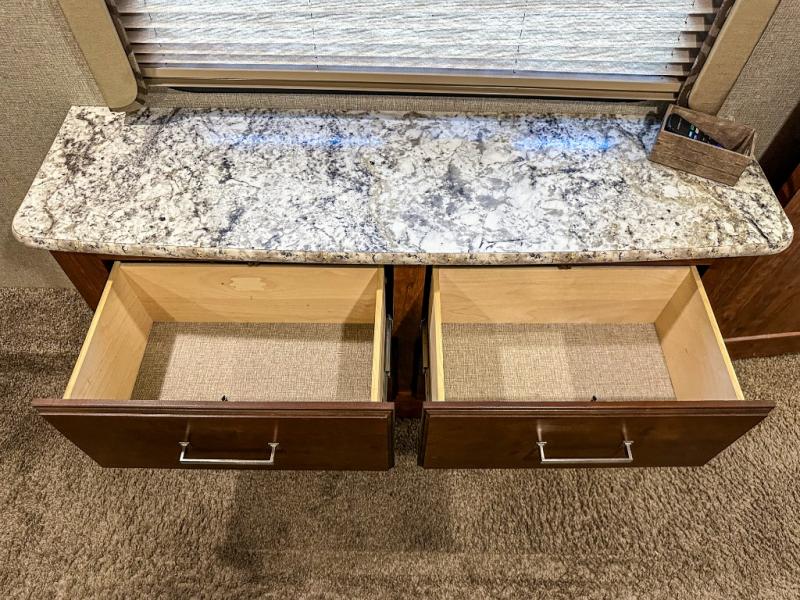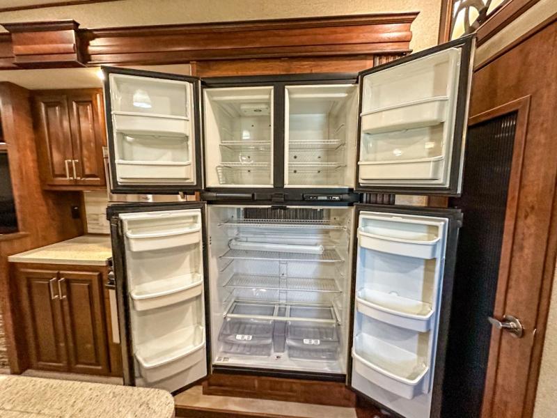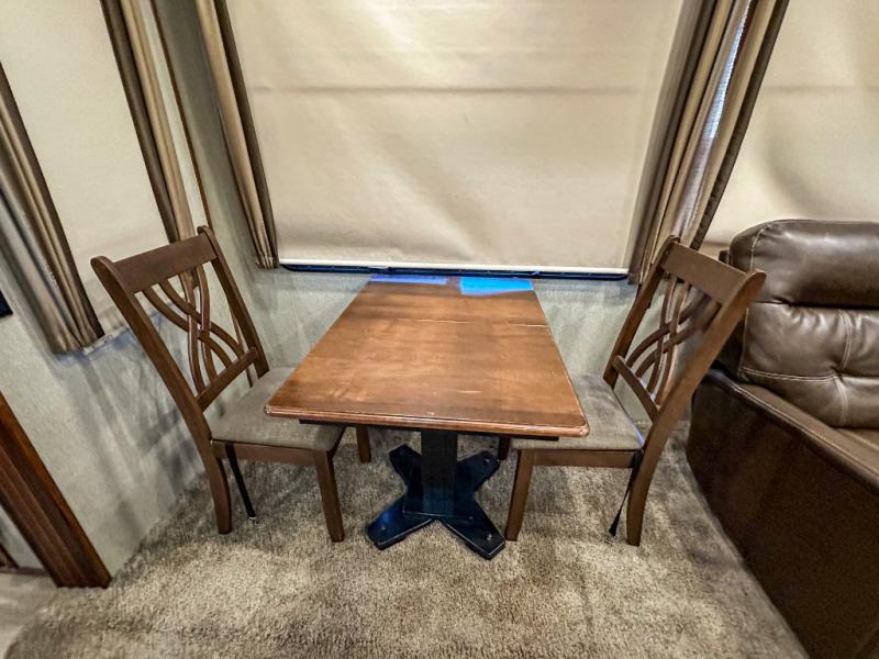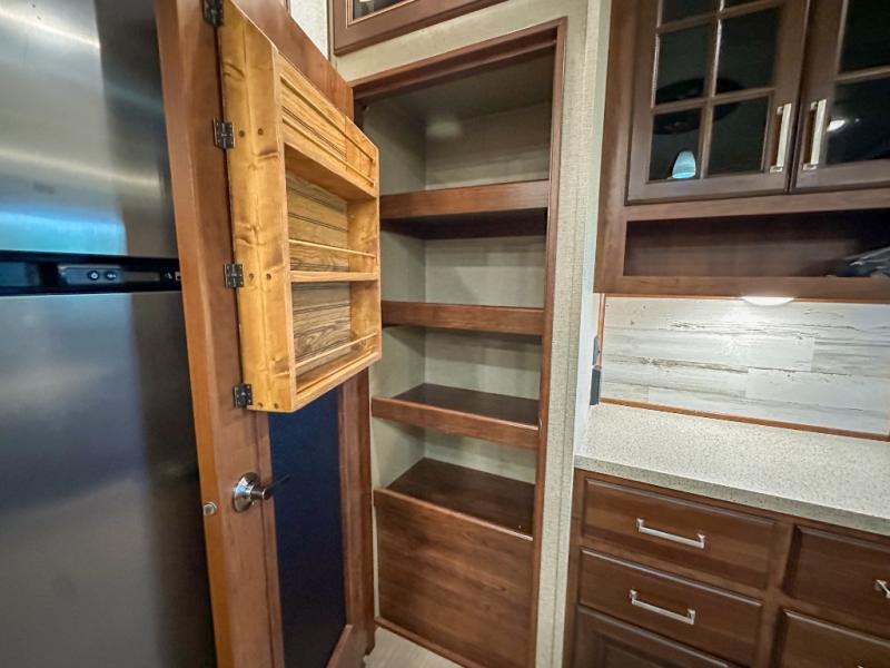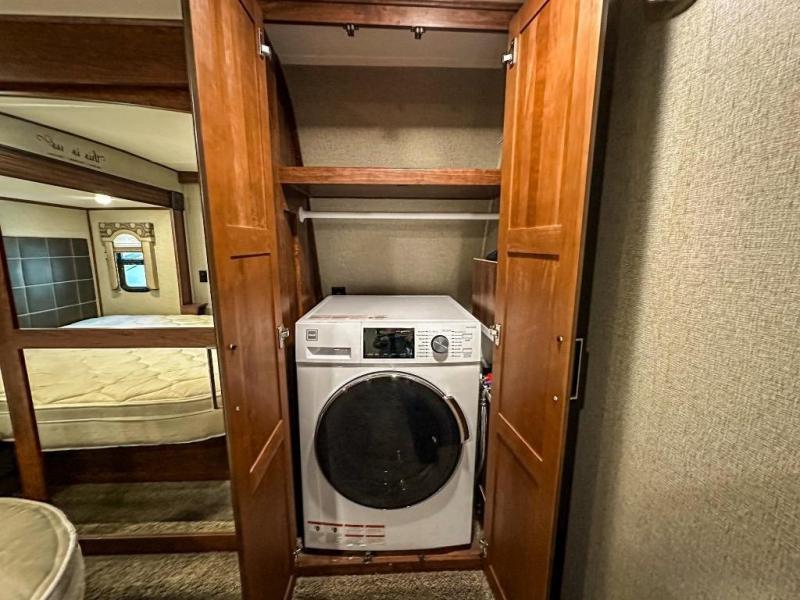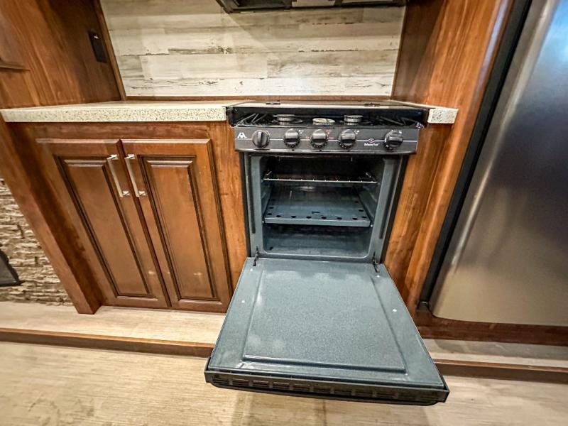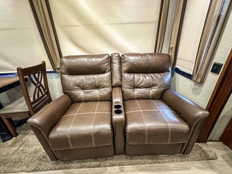 The perfect fifth wheel for entertaining and relaxing is this Keystone Avalanche model 320RS. The combined living and kitchen area includes dual slide outs for more walking around floor space, plus seating for 9 people with the furniture provided. This unit offers an 18 cu. ft. refrigerator, and a kitchen island for serving appetizers and cleaning the dishes in the sink. There is an entertainment center and a 50" LED TV for your inside enjoyment with a fireplace to keep you warm, plus a pantry, curio, and much more!