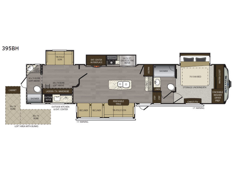 It's time to imagine how this Keystone Avalanche fifth wheel fits perfectly into your life style of "Going big or going home!" Model 395BH offers you a master bedroom and bathroom with a king bed, plenty of storage including under the bed and in the chest, and quick access to the bathroom. The kids or grandkids will be able to draw straws for the loft area bunks when they come to visit. The wide open kitchen and living area allows plenty of campers to gather together to watch the 50" TV, play games at the removable table, and stand around the kitchen island eating food and talking about their day. So if you are a couple that needs an extra living room, or you are a family with kids that enjoy their own space in a loft or sleeping on one of the tri-fold sofas, this Avalanche is the perfect fit!