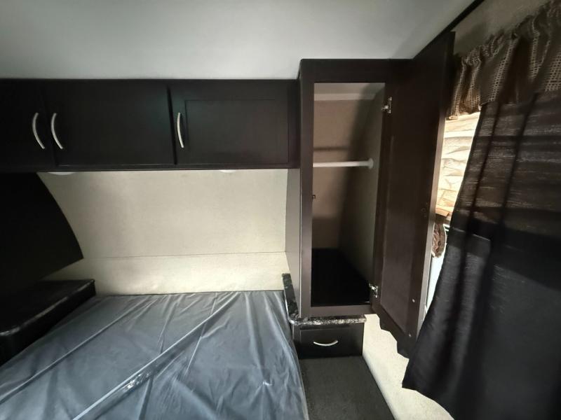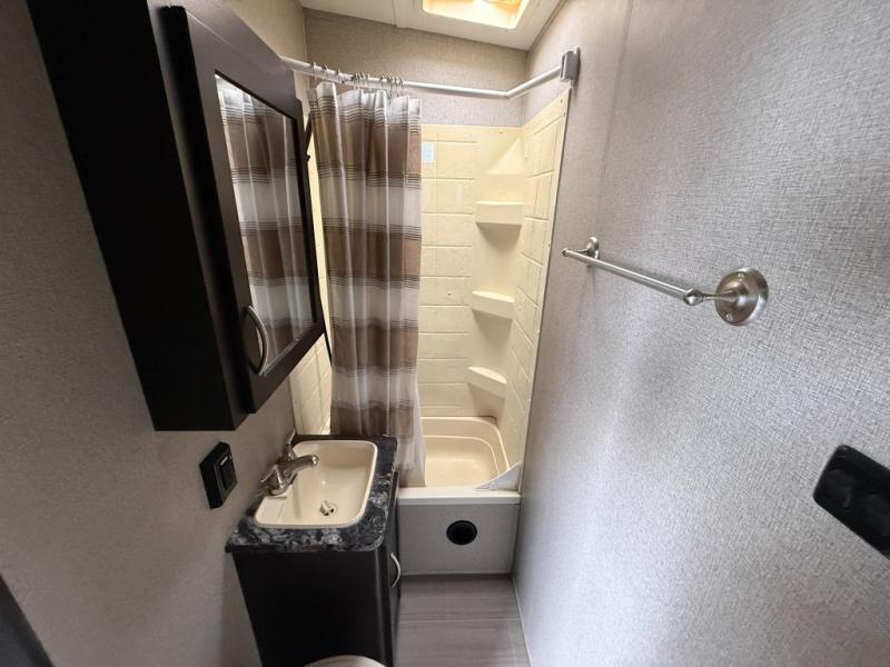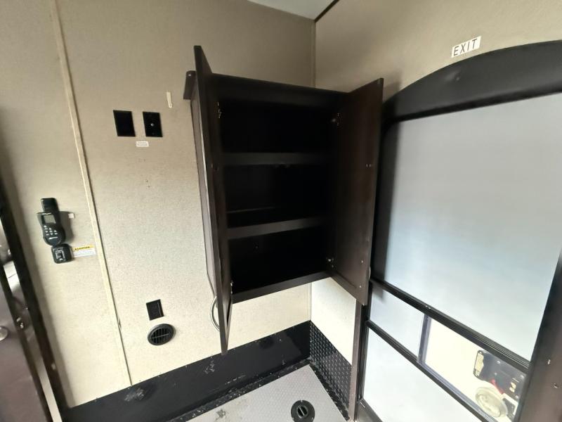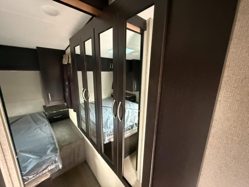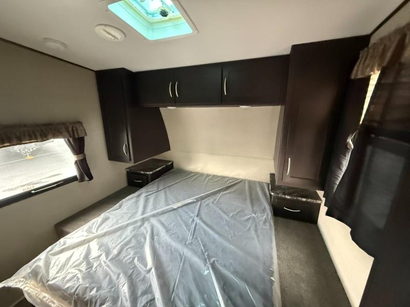 A sliding door in front takes you into the front master bedroom where you will enjoy a queen size bed with dual nightstands and overhead storage. The slide out wardrobe is split between the hall and bedroom when the bedroom sliding door is closed.