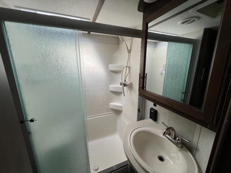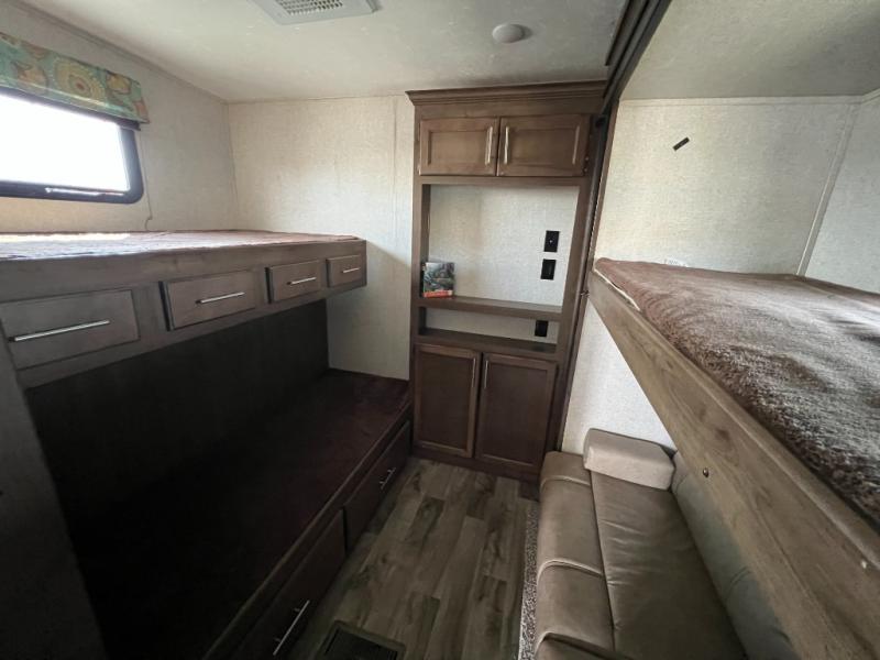 Toward the middle of the coach, the dedicated bunkhouse provides a flexible retreat for family or guests, offering room to spread out without sacrificing privacy. The front bedroom features a walk-around queen bed and ample wardrobe storage, giving you a peaceful place to unwind. A spacious bathroom with a residential shower ties everything together with convenience and comfort. Designed for extended stays or full-time living, the Cougar 369BHS blends warmth, function, and generous space in a way that feels like settling into a well-crafted home away from home.