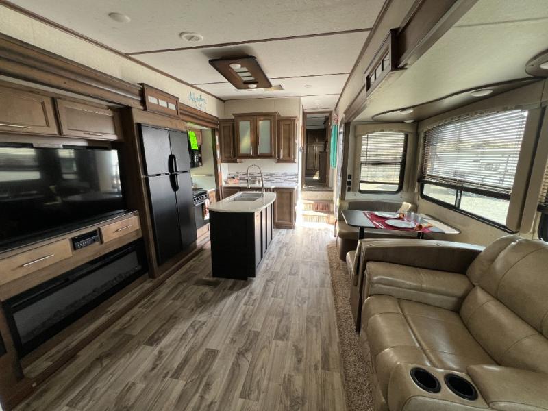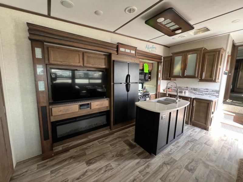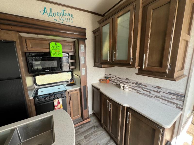Step into the 2018 Cougar 369BHS and you’re welcomed by a spacious, residential-style living area that immediately feels warm and inviting. The centerpiece of the main room is the electric fireplace, adding both ambiance and comfort while giving the space a true home-like charm. Large windows, generous seating, and a well-appointed kitchen create an open, welcoming environment perfect for gathering, entertaining, or simply relaxing after a long day. The kitchen’s ample counter space, solid cabinetry, and thoughtful layout make everyday cooking feel easy and enjoyable.