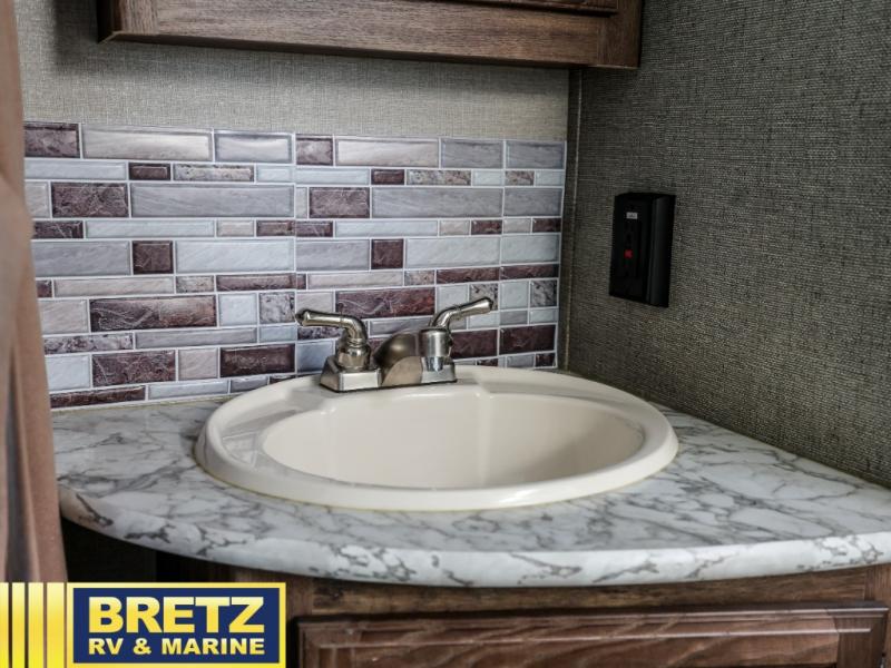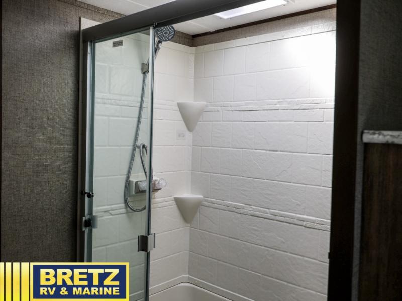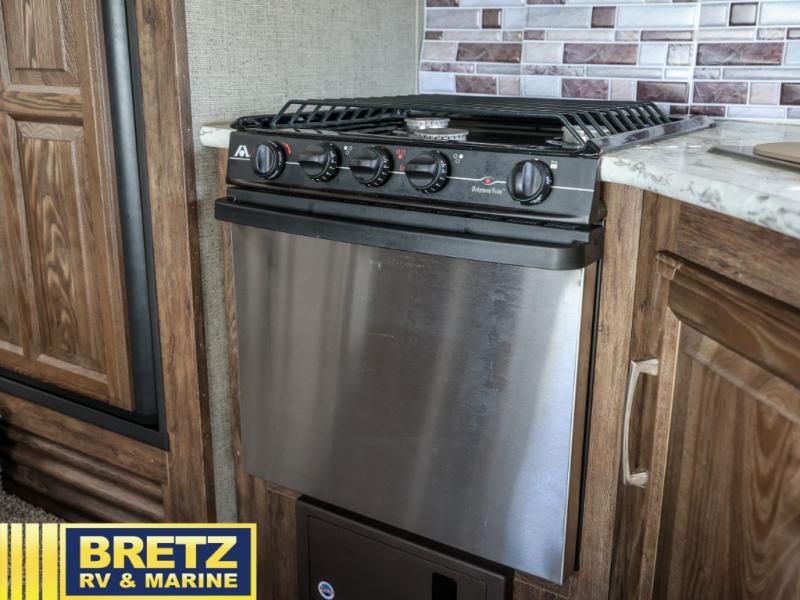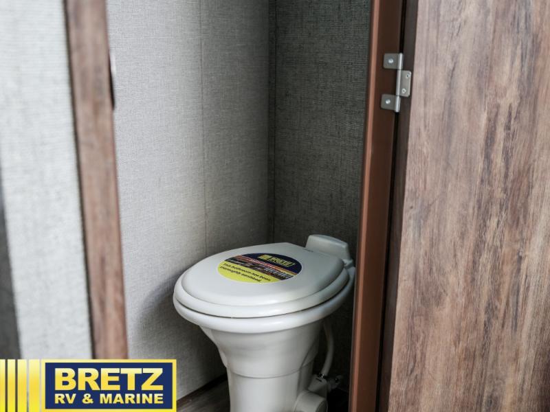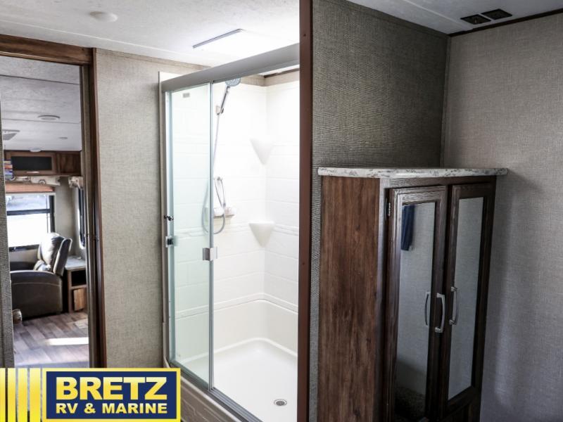 If you are a couple or family of 3-4 that enjoys camping in a fifth wheel, take a look at this Keystone Cougar Half-Ton Series model 246RLSWE. You will find plenty of room to read a book or enjoy your friends in the rear living area with two chairs, and on the dinette slide out. There is a walk-through full bath providing a private toilet room with a sink outside and the shower on the opposite side inside the bedroom. This allows you to wash your hands while others are using the facilities. It's the perfect fifth wheel for those that enjoy inside amenities without a lot of hassle.