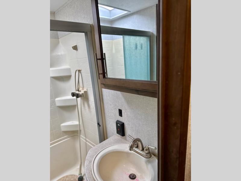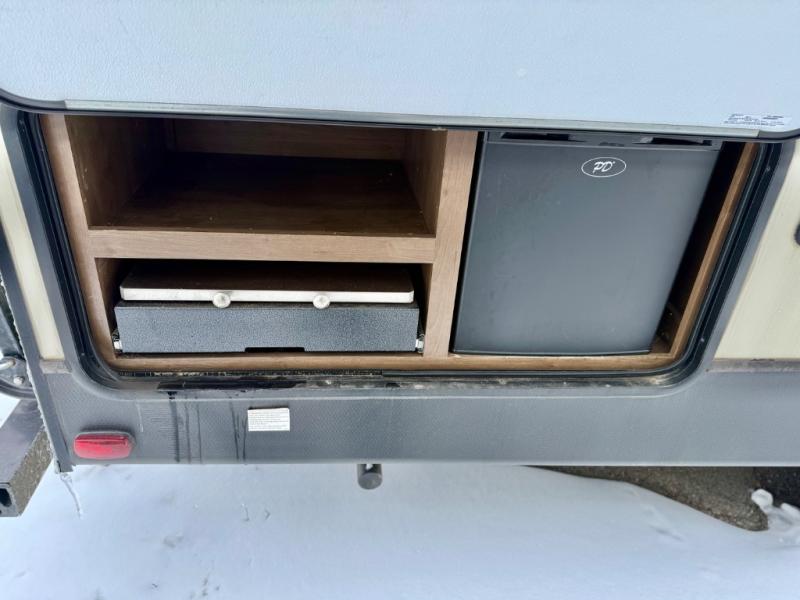 If you are a couple or family of 3-4 that enjoys camping in a fifth wheel, take a look at this Keystone Cougar Half-Ton Series model 25RES. The Hitch Vision backup mirror provides a safe and easy way to hitch up and park at any destination. Outside, you can enjoy grilling on the capital grill and storing your drinks in the mini refrigerator while visiting with other campers. The two slide outs provide more interior floor space, and the rear entertainment center including storage allows you to relax inside while the chef is cooking, plus there is more to see!