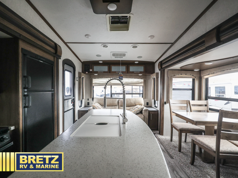 The chef in the family is sure to enjoy preparing meals on the kitchen island and being able to view the pop-up TV from the rear tri-fold sleeper sofa and the kitchen area in this Keystone Cougar Half-Ton Series fifth wheel model 27RLS. You will find that the triple slide outs provide more interior floor space to move around inside. Outside the unobstructed pass-through storage compartment makes loading and unloading your outdoor gear a breeze. And the Hitch Vision backup mirror provides a safe and easy way to hitch up and park at any destination.