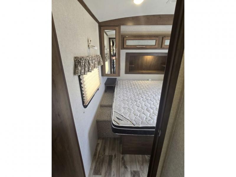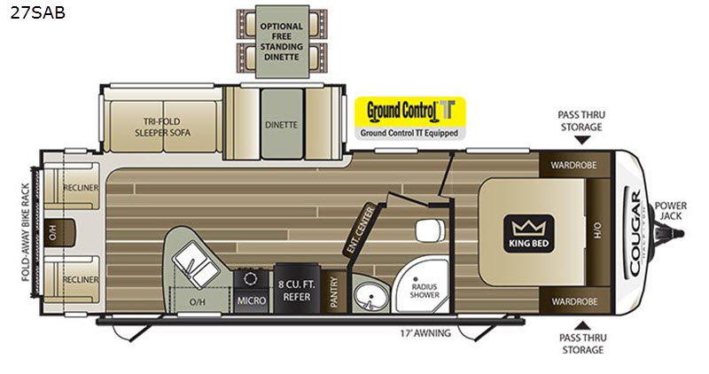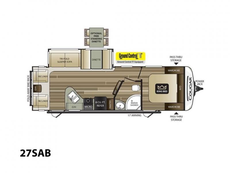If you are a couple or a family of 5 this Cougar Half-Ton Series travel trailer 27SAB will provide plenty of room for relaxation and sleeping space for all! Just imagine sitting in one of the two recliners while the kids sit on the additional furniture in the single slide out. You also have full kitchen and bath amenities, plus a private master bedroom with a second entry/exit door. You will have no worries setting up for the weekend thanks to the Ground Control and power jack. Come see what else you can't camp without, choose this model today!
