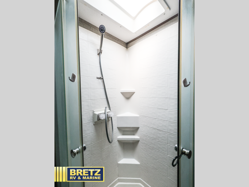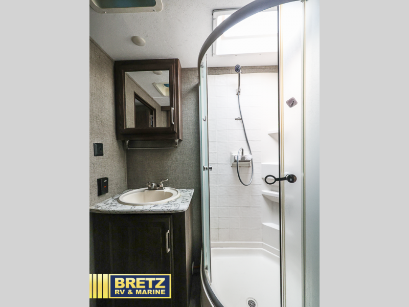 As you enter model 29RKSWE notice the convenient location of the complete bath which features a neo-angled shower, toilet, sink, and linen cabinet. There is also a second entry door for direct access into the front master bedroom.