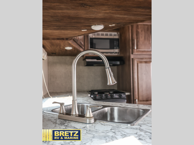 Head back to the main living area to the left of the entry door and find two lounge chairs with an end table between, plus overhead storage. You can choose optional theater seating instead if you like. On the opposite side of the room there is a slide out sofa with storage above, and a u-shaped dinette. This provides plenty of seating to enjoy your meals at, and the nearby entertainment center can easily be viewed from any seating in the room.