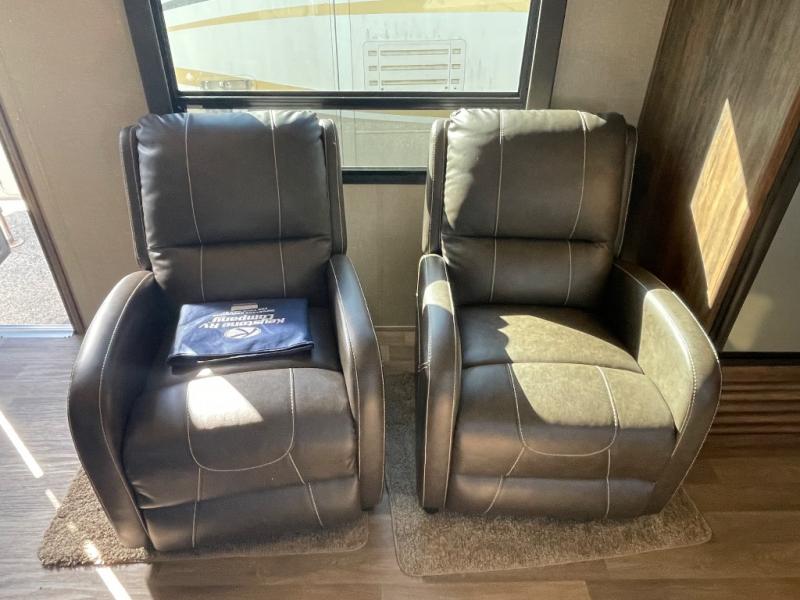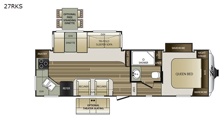 Step inside and see the recliners to the left of the door with storage cabinetry above each, or you can choose optional theater seats. There is an entertainment center straight ahead through the door plus space to store things above and below.