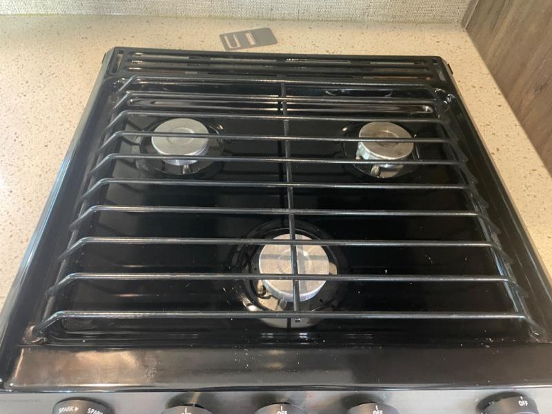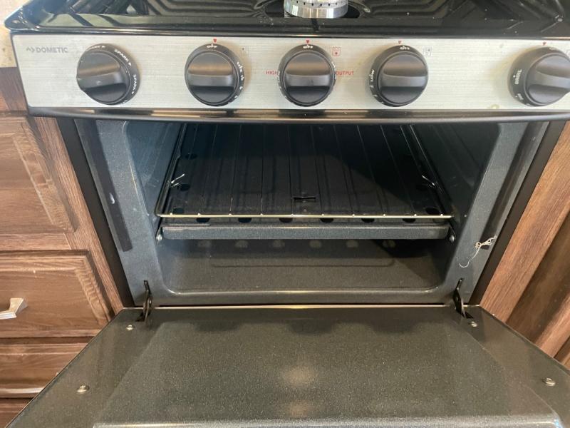The rear of the unit offers a kitchen with all the amenities you need to prepare and cook food for your family. There is a refrigerator, double kitchen sink, a three burner range, and pantry with overhead storage.