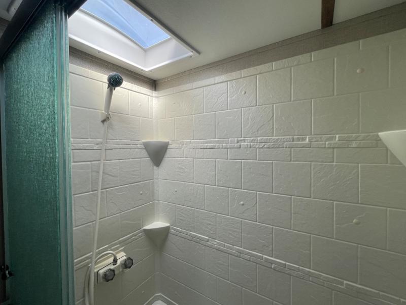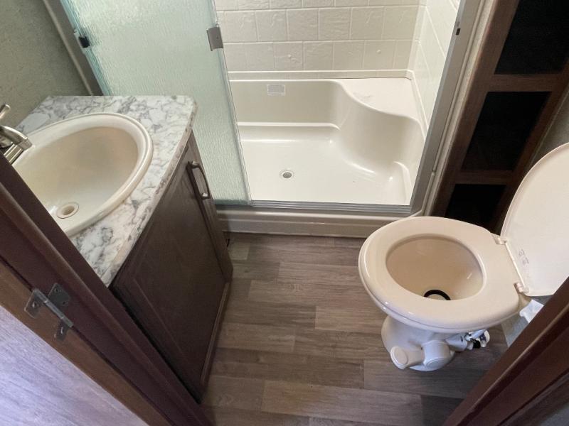 To the right of the entry door head up a step to the front master bedroom and bathroom. The side aisle bath is on your left and features shower, toilet, and sink. The bedroom also offers a queen size bed, bedside wardrobe, and nightstand, plus so much more!