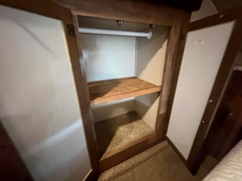 The bedroom offers a comfortable queen size bed with a bedside wardrobe and nightstand. You will also find a slide out wardrobe for additional storage, and a hamper/TV location next to the slide, plus so much more!