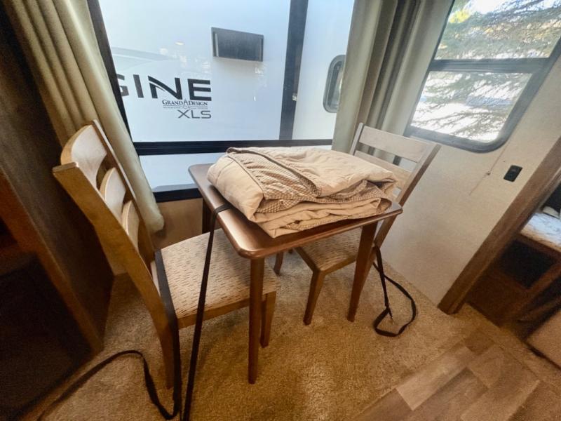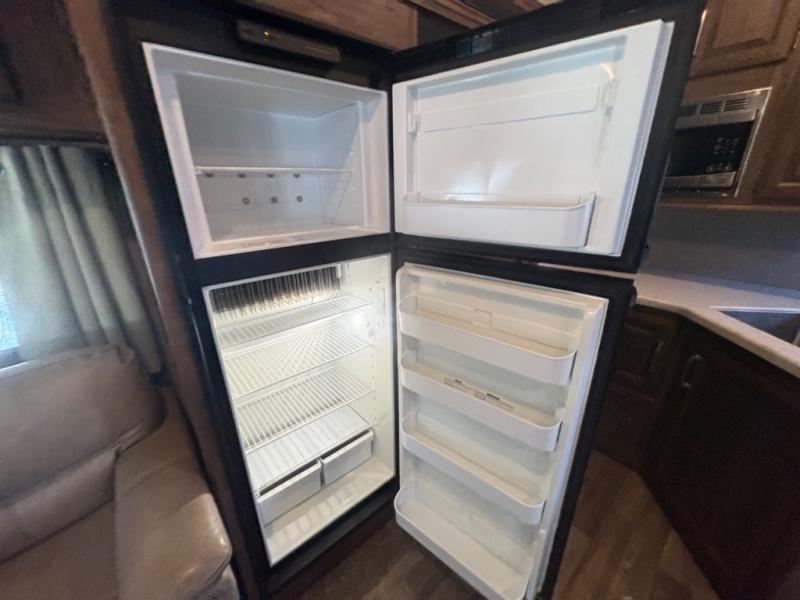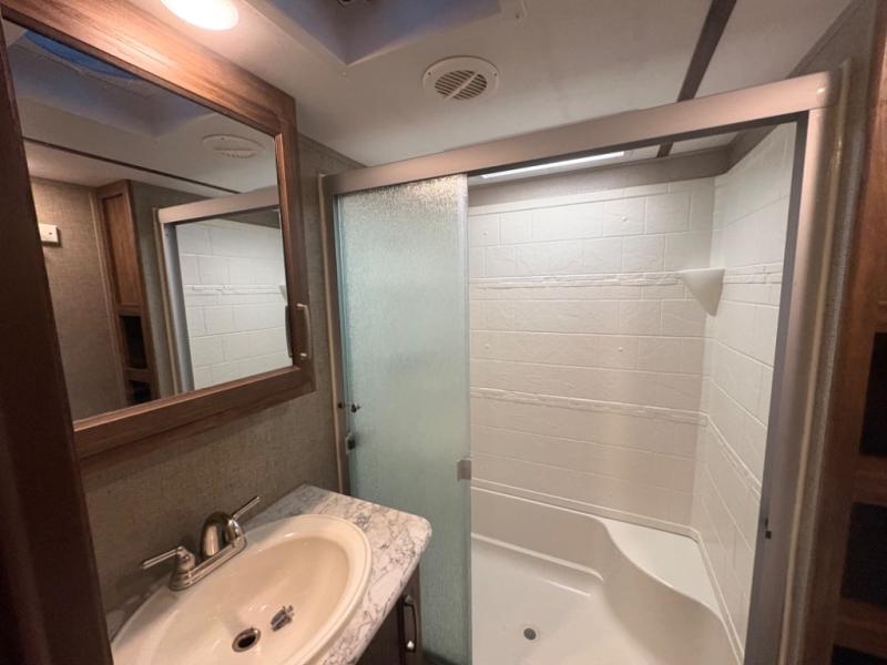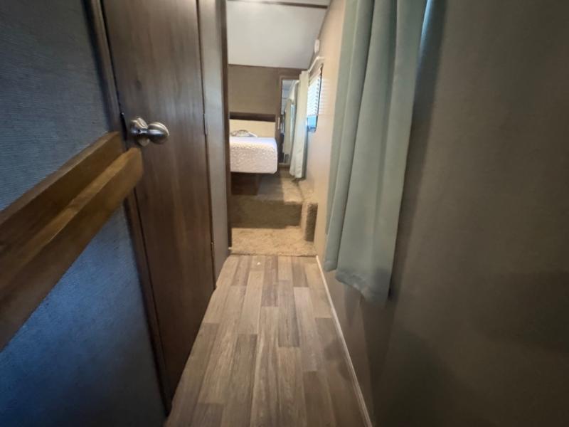 Entering model 28SGS takes you right into the combined kitchen and living room space. There is a slide out entertainment center/pantry, and a free standing dinette with four chairs. You may choose the booth dinette option instead.