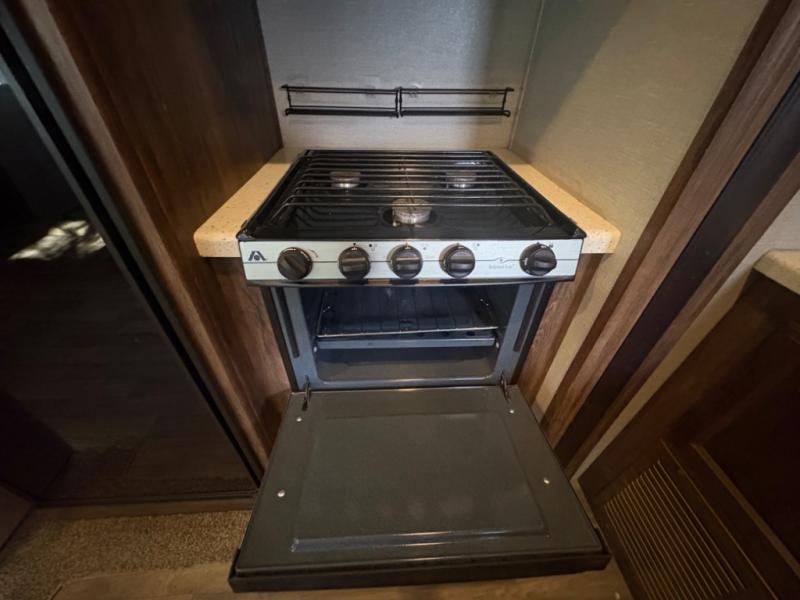 There is a tri-fold sleeper sofa, refrigerator, and three burner range slide opposite the door side. There is additional counter space along the interior wall that features plenty of prep space and includes a double sink in an angled part of the countertop, and overhead storage.