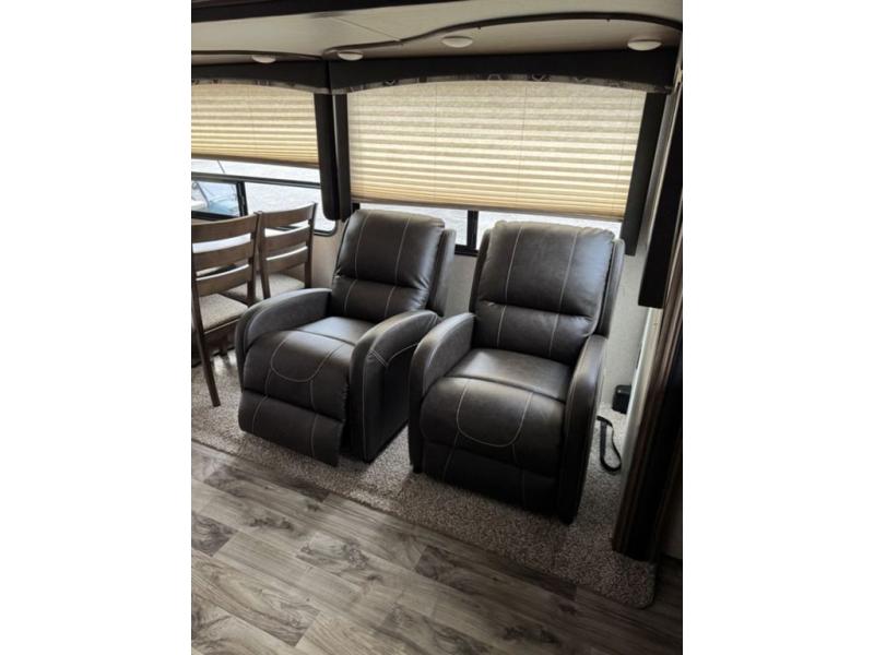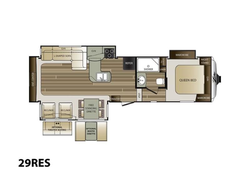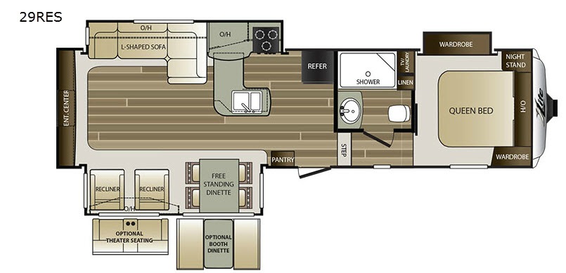 To the left of the entrance just beyond the pantry find a free standing table with chairs and two recliners, or you can choose an optional booth dinette to enjoy your meals at, and optional theater seats. The slide out helps to create more floor space, with more room to move around.