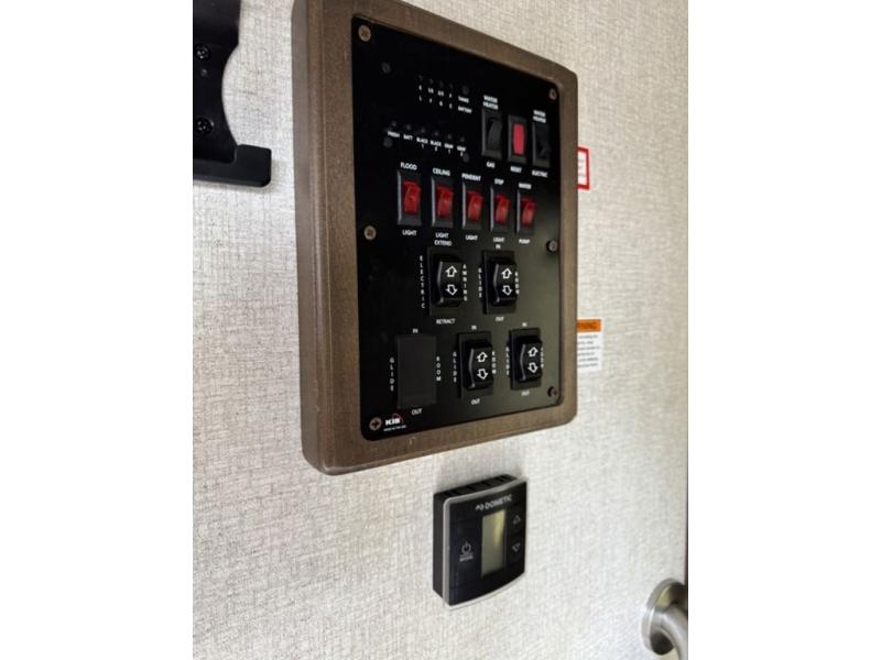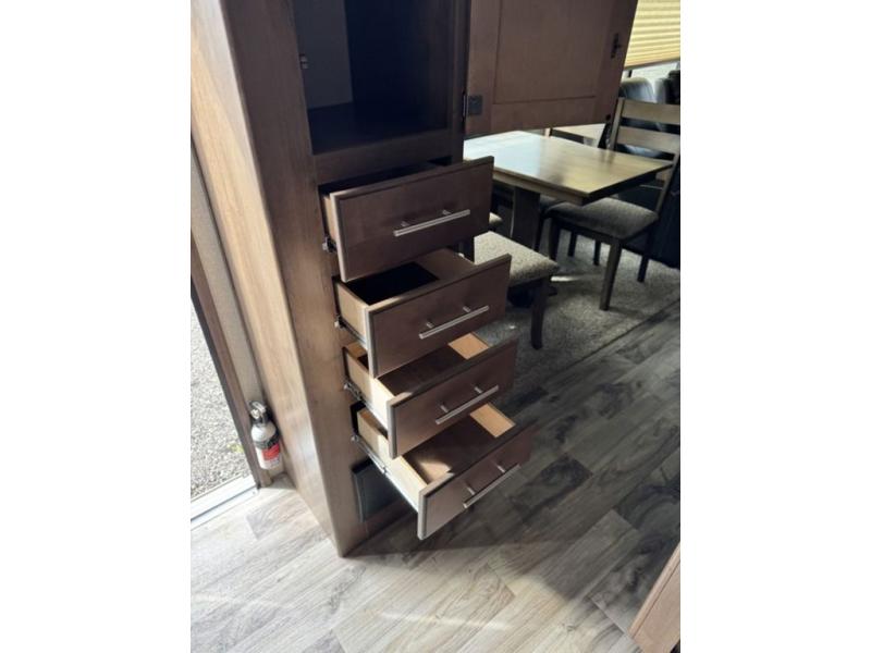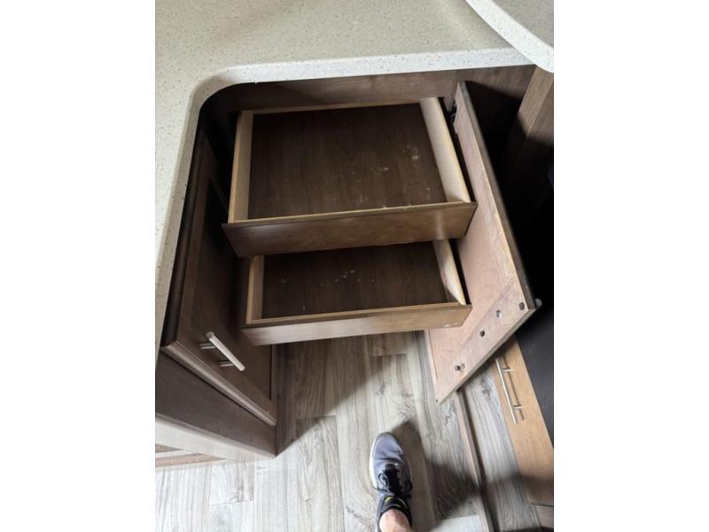 Opposite, within the kitchen amenities slide there is a L-shaped sofa with storage above. Seated here you can easily enjoy conversation with family and friends, and also enjoy watching your favorite movies or television shows on the rear entertainment center that stretches across the entire width of the unit.