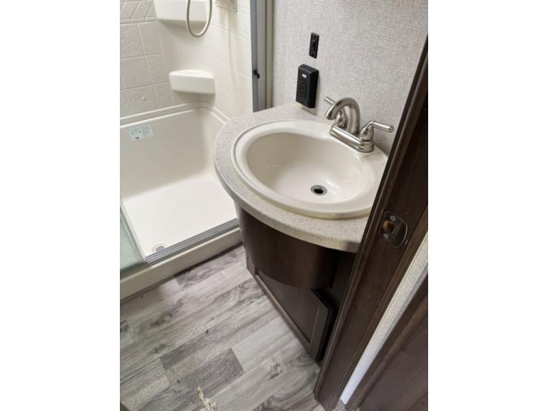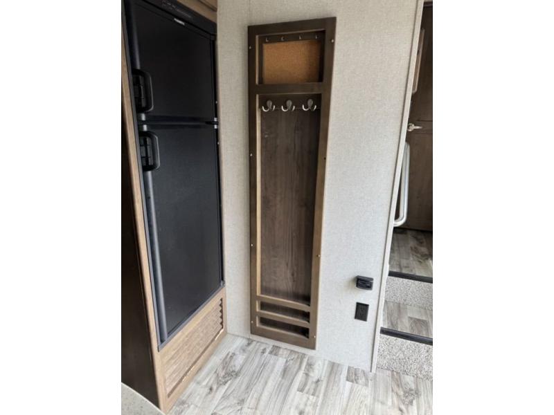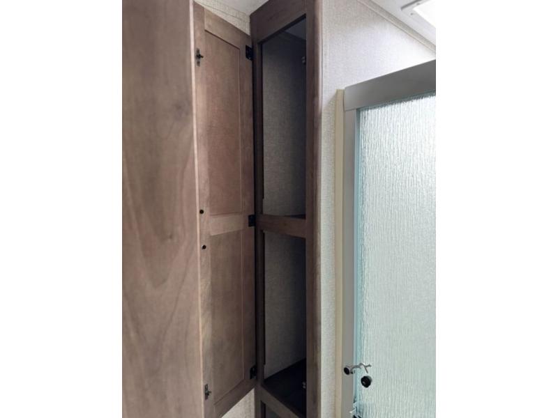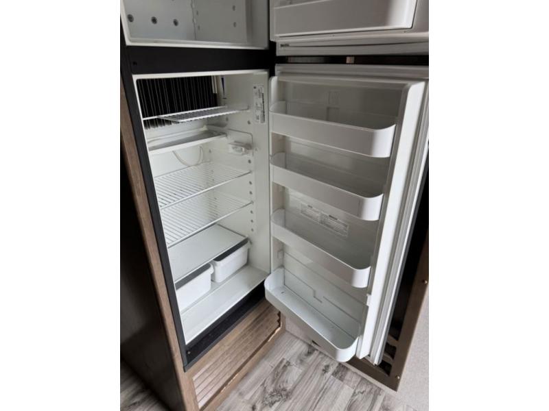Step inside and find yourself in the kitchen where you can comfortably prepare and cook all of your favorite foods. There is a refrigerator straight ahead, a pantry to the left of the entry door, and a L-shaped counter with a double sink, and three burner range that is all part of the road side slide out. You will also find plenty of overhead cabinets for storing dishes and things as well.