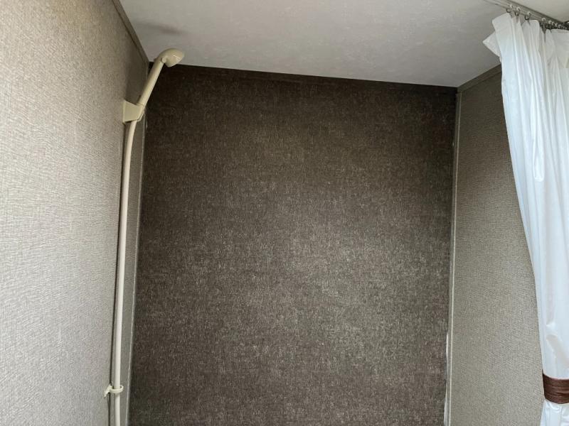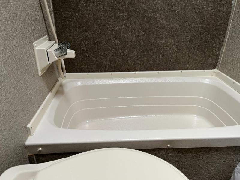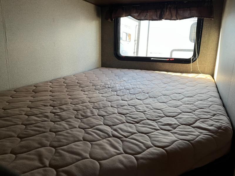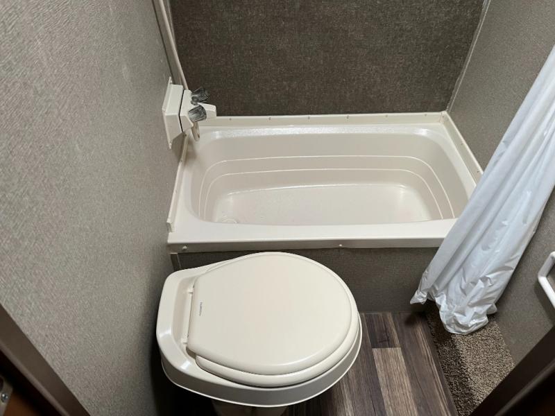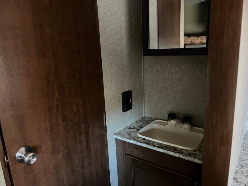 The private bedroom area offers a peaceful sleeping environment with a comfortable bed and storage for clothing and personal items. The full bathroom is conveniently located, featuring a shower, toilet, and vanity, making daily routines easier on the road.