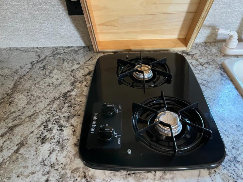 The efficient kitchen includes a cooktop, microwave, refrigerator, and plenty of storage for cookware and pantry essentials. With thoughtful counter space and cabinet organization, the kitchen keeps meal prep and cleanup simple — whether you’re making quick breakfasts before hitting the trail or grilling dinner at sunset.