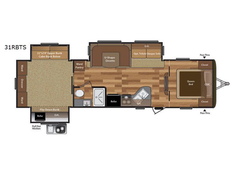 The 2018 Keystone Hideout 32RDDS is a rear-living room travel trailer with a rear-door bunkhouse, sleeping 6-8 people and featuring opposing slide-outs and theater seating in the living area. Key features include a large kitchen with ample counter space and storage, residential-style stainless steel sink, and a power awning. It is designed for entry-level RVers, offering a good balance of features and affordability, with robust construction including reinforced walls, floors, and a crowned roof.
