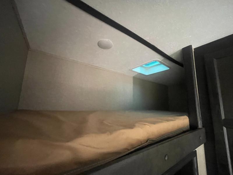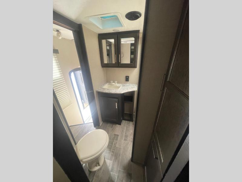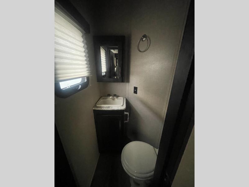 Spend a lot of time outside with this Keystone Impact toy hauler fifth wheel model 367. There are dual awnings, just open them up, add a few camp chairs and enjoy a beautiful day outside. There is also an 8' ramp that helps you unload your toys quickly and easily so getting to your offroad adventuring is a breeze. The interior of this unit is perfect for those days where you may not be able to be out and about. There are triple slide outs which open up the space inside. The private front bedroom has a full walk around queen bed and a full wardrobe. Once all the toys are unloaded there are dual opposing sofas, a half bath, and an electric queen bed that comes down for sleeping space at night. The loft is a place the kids may have to draw straws for!