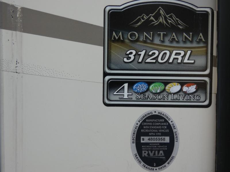 When you are ready to head out in comfort to see the countryside, take this Montana fifth wheel with you. Model 3120RL offers a rear living and kitchen area with dual slide outs for more walking around floor space, plus seating for the whole gang including theatre seats with power recliners. You are sure to enjoy the HDTV and fireplace on those inside camping days. The kitchen offers the chef a center island for preparing food, an 18 cu. ft. RV refrigerator, a convection microwave, a coffee station for the coffee lover in the family, and a pantry for your dry goods, plus more. You will also find plenty of storage throughout for all your things. Outside there is an entertainment center with 32" HDTV and two awnings providing an outdoor living space, and additional storage. Take a look, you will be pleased you did.