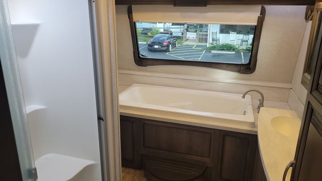 You are sure to love all of the amenities throughout this 3921FB Montana fifth wheel by Keystone RV! Starting with the master suite featuring a walk-through bedroom to the front bathroom with a unique soaking bath tub, dual sinks, and a shower with seat. You will also find a half bath for your guests across from the main entry. The combined rear living and kitchen area allows you to make meals, visit with family, and relax while watching the HDTV all while being comfortable on the furniture with the warmth of the fireplace. You will also enjoy the kitchen island, an 18 cu. ft. residential refrigerator, convection microwave, a coffee station, and a pantry. Outside you can watch the 32" HDTV and entertainment center, relax under one of the two awnings and enjoy the fact that you own a Montana.
