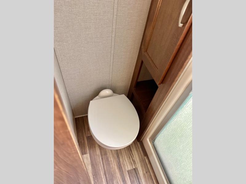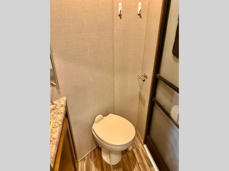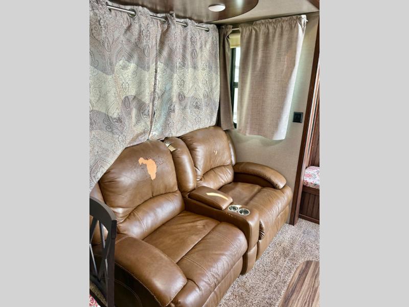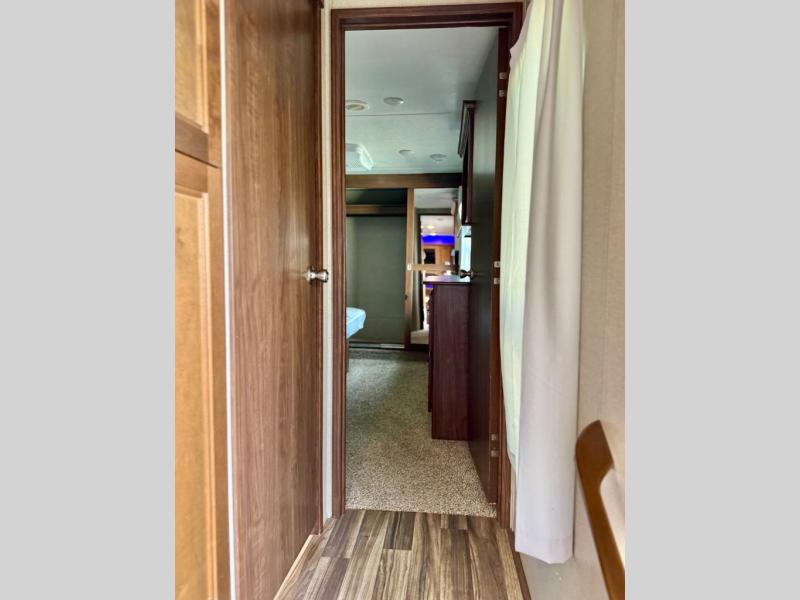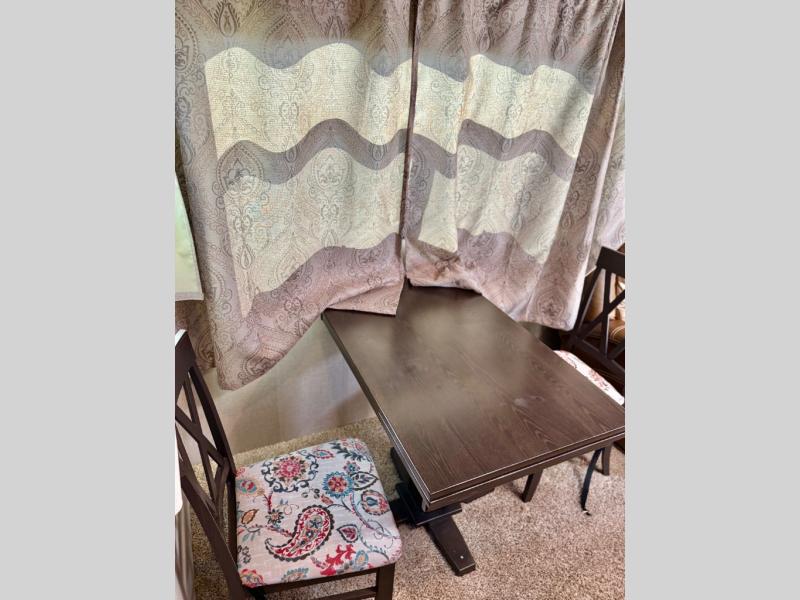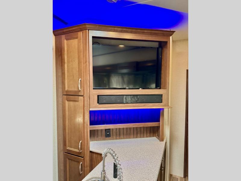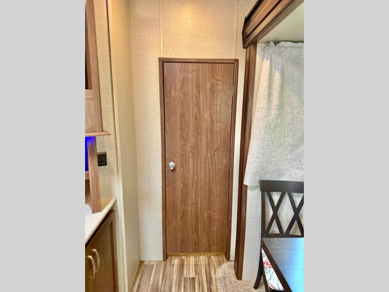 Opposite the door side find a slide out dining table with four chairs, and optional theater seating for two with cup holders. Along the interior wall there is a lounge seat with overhead cabinets. There is a nice entertainment center along the outside wall of the half bath that can easily be viewed by any seating in the room.