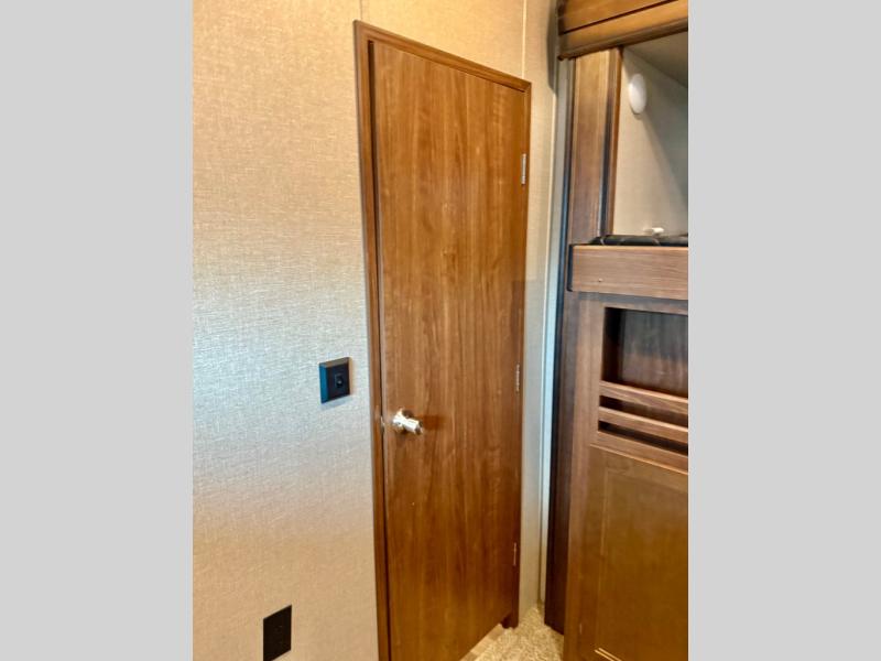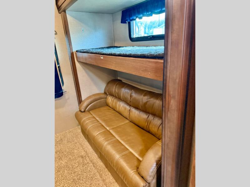 The very rear of this unit features a private bunkhouse that the kids will certainly love along with a private entry from outside into the half bath for added convenience. The bunkhouse features a hide-a-bed sofa slide with fold down bunk above on the right, and a single bunk above storage and the outside kitchen on the left.