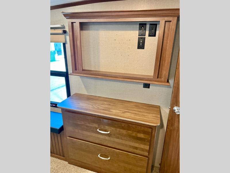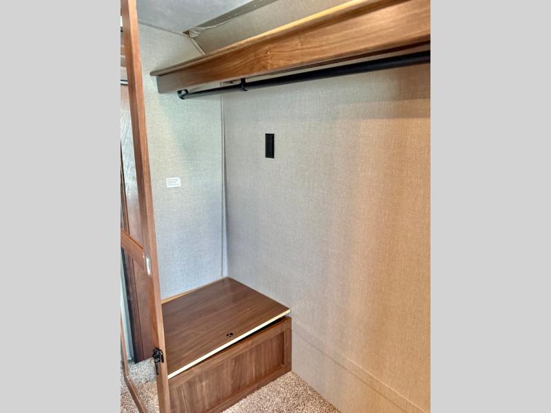 Further down the hall find the master bedroom with a slide out queen or optional king size bed, nightstands, and under bed storage. Opposite find a dresser with a 32" HDTV above, and seating along the side. The front wall features a spacious wardrobe and there is space prepped for a washer and dryer as well.