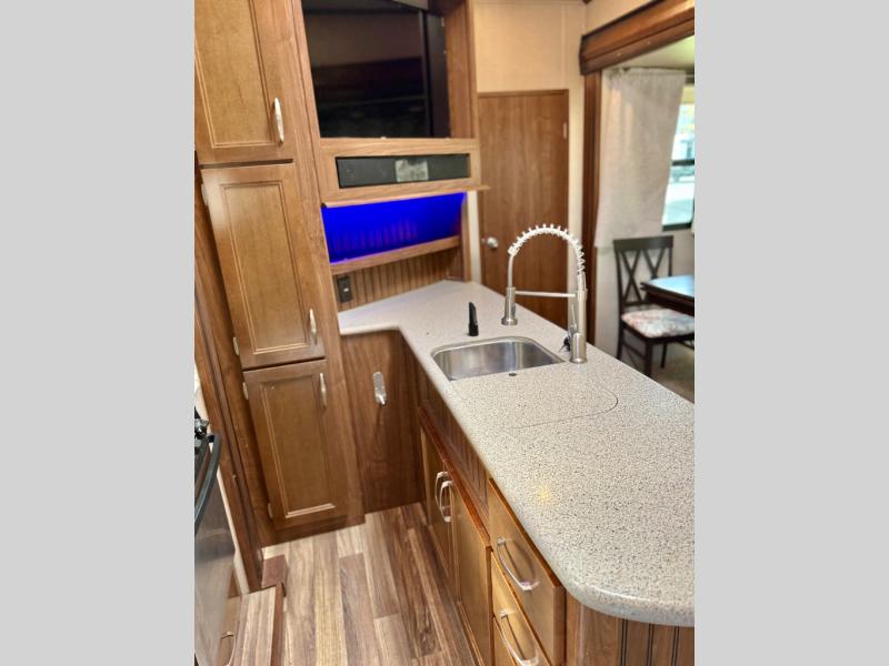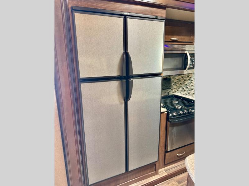 Back down to the main living area notice the kitchen begins to the left of the entry door. Here you will find a RV refrigerator and three burner range with overhead residential microwave slide out. A pantry is adjacent along with a counter peninsula including a double kitchen sink, plus plenty of storage.